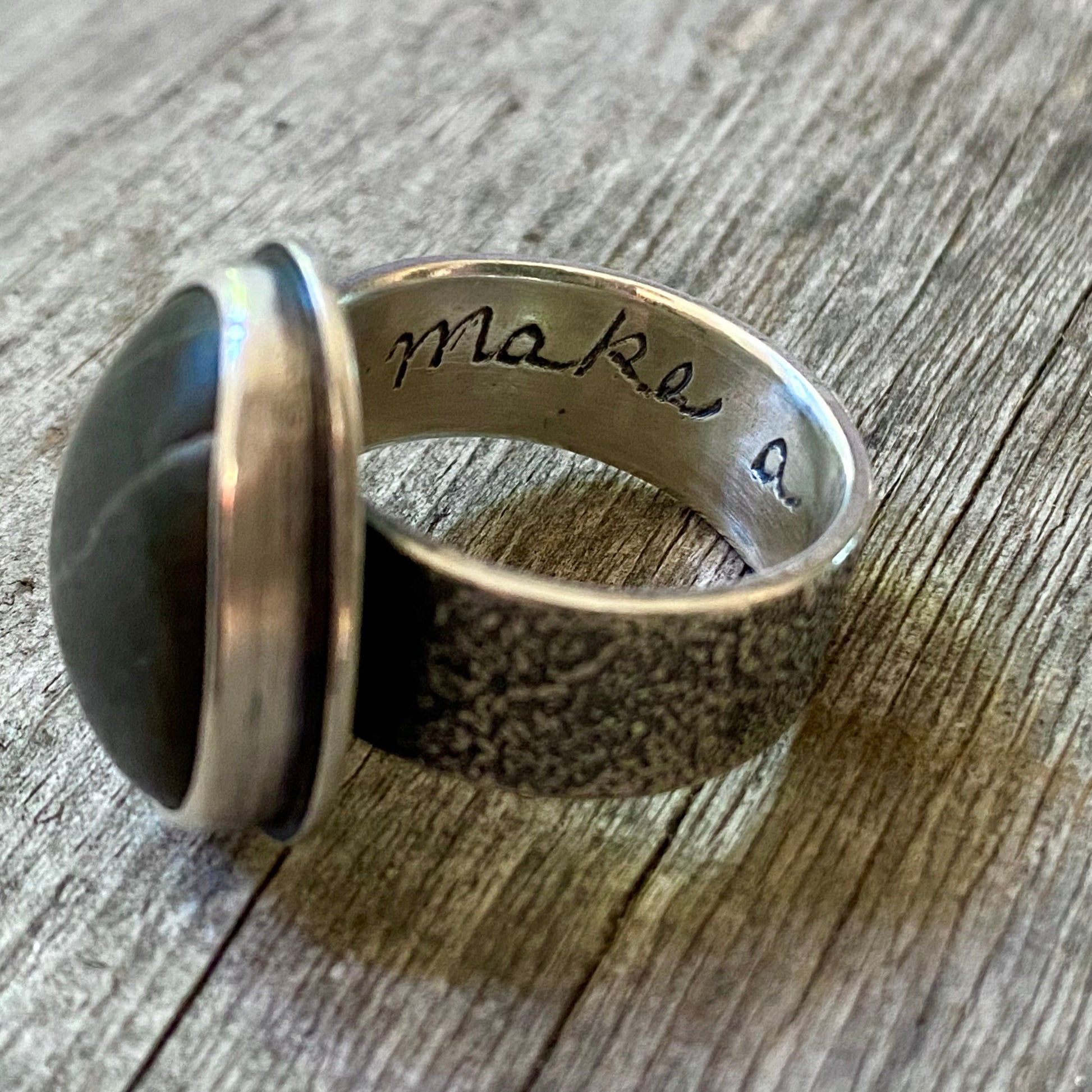 The stone is encapsulated in a fine silver border and rests on a sterling silver back plate. I have made the band from sterling silver and a little bit of magic by recycling silver dust and fusing it to the ring band, creating a texture that mimics many of the wishing stones themselves. The back of the band features my Moss Rock Metals makers mark.