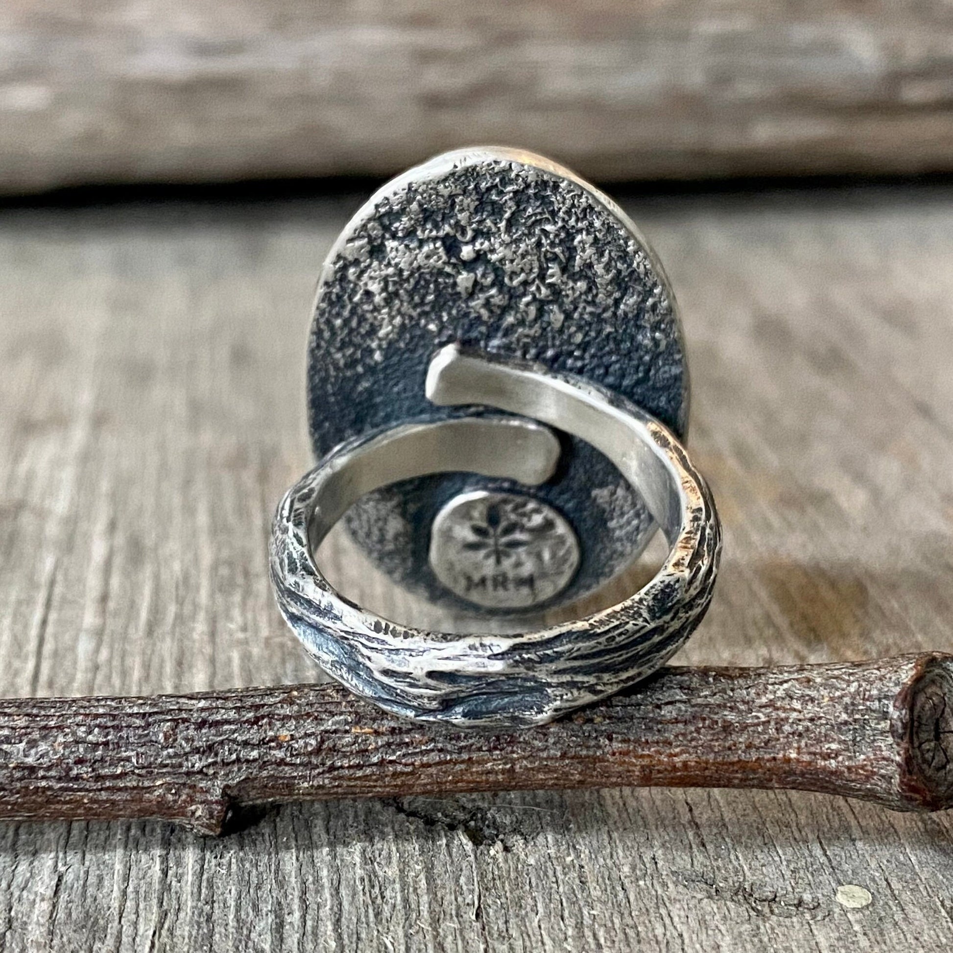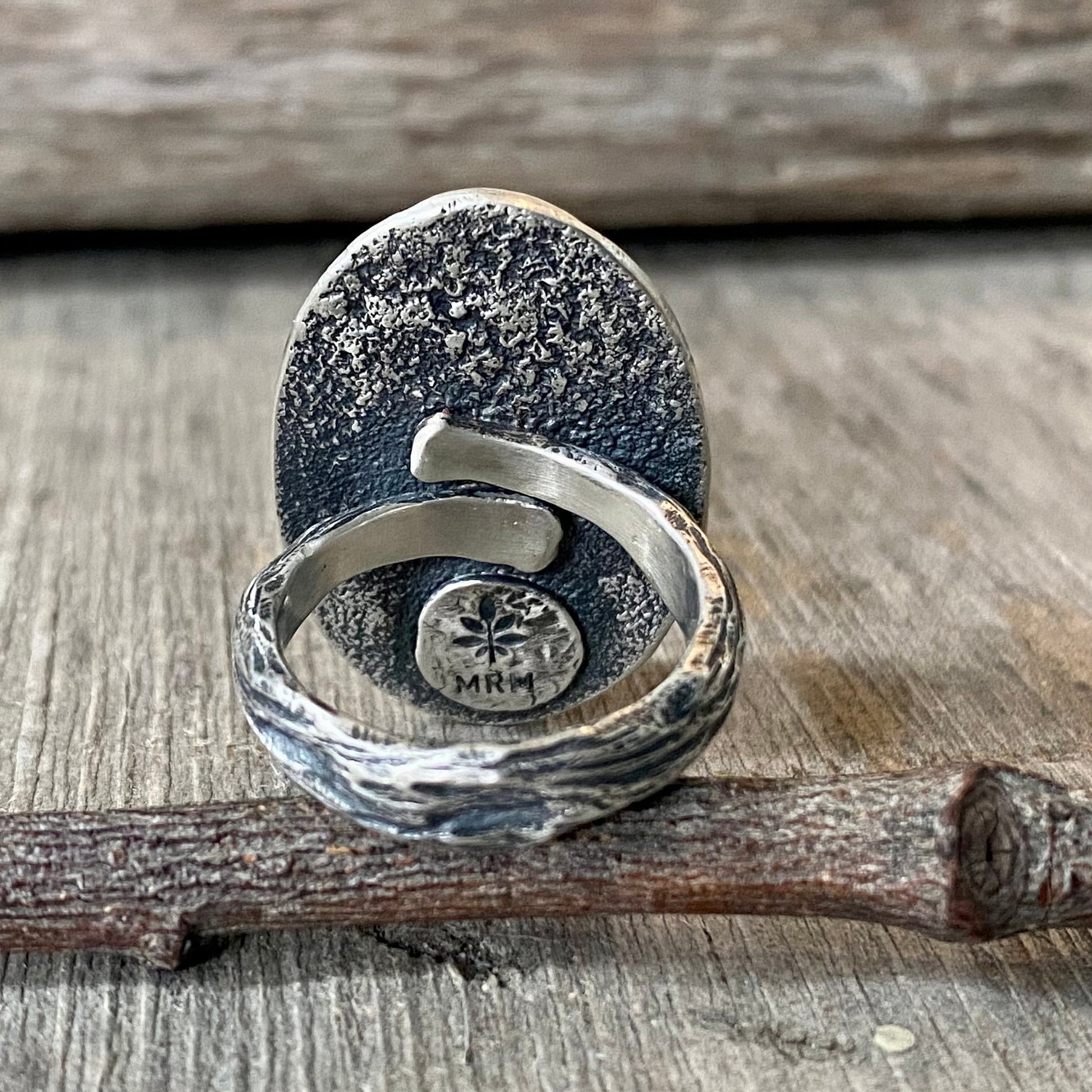 The sterling silver that makes up the band, was formed with fire and then carved in to a twig. The texture on the back was created using recycled sterling silver dust and melting it until it formed this beautiful lichen texture.