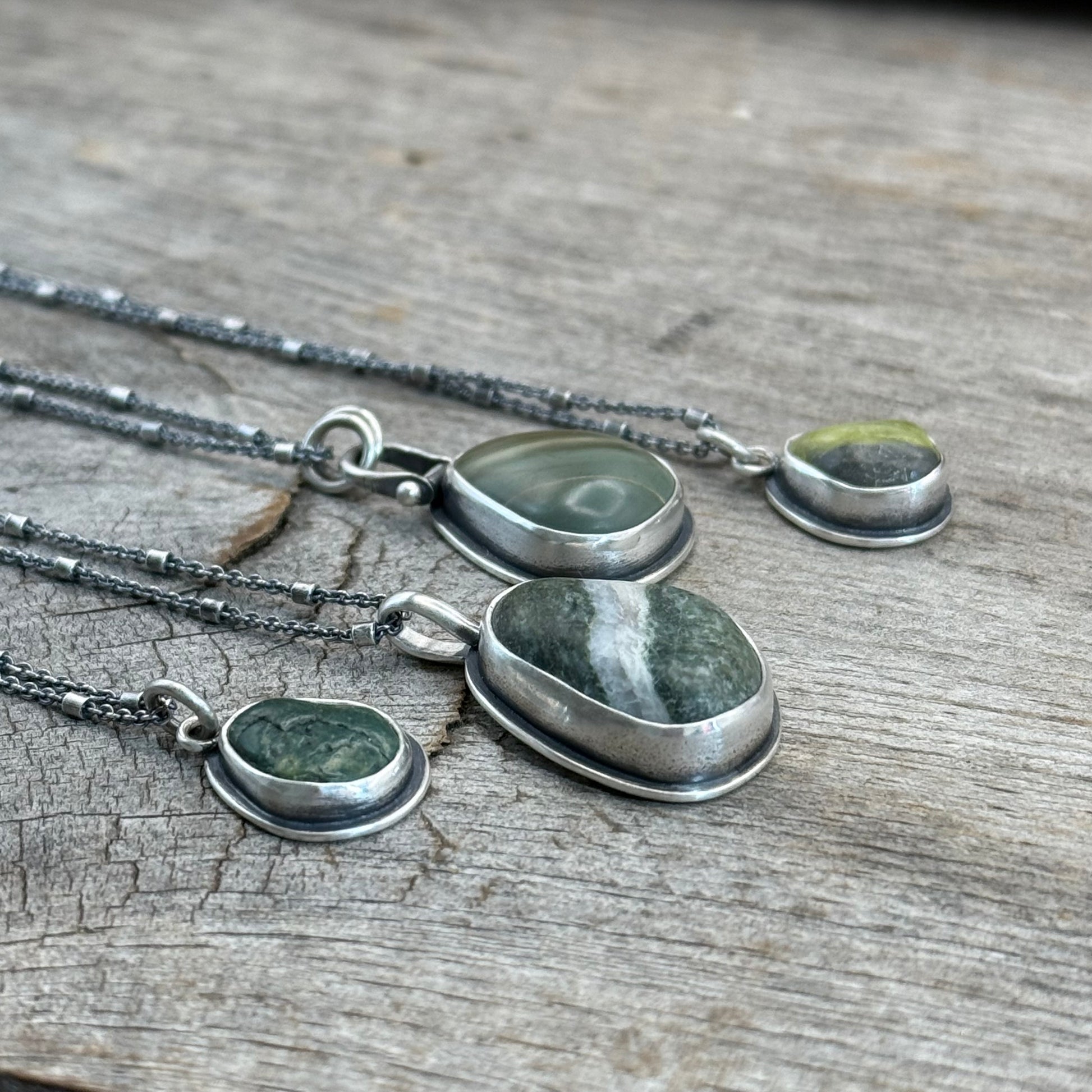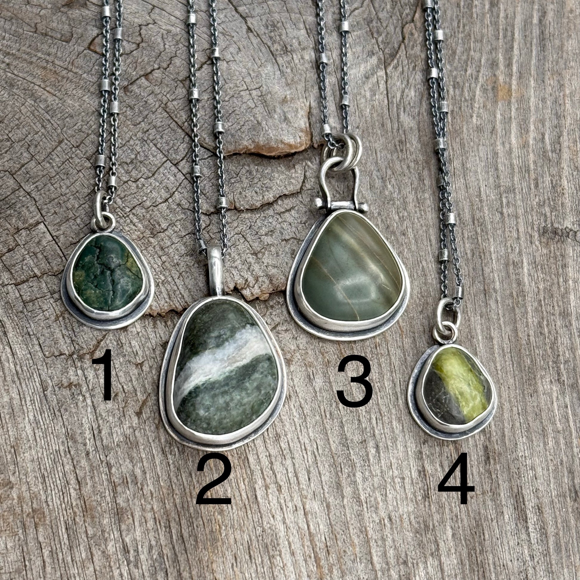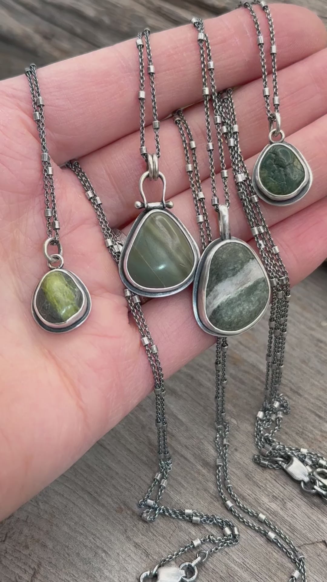 These pendants feature some of my absolute favorite green beach stones that I found right here in the PNW and Vancouver Island.  The colors are so earthy and beautiful and the stones have been tumbled to perfection by the ocean; they feel so soothing to the touch.