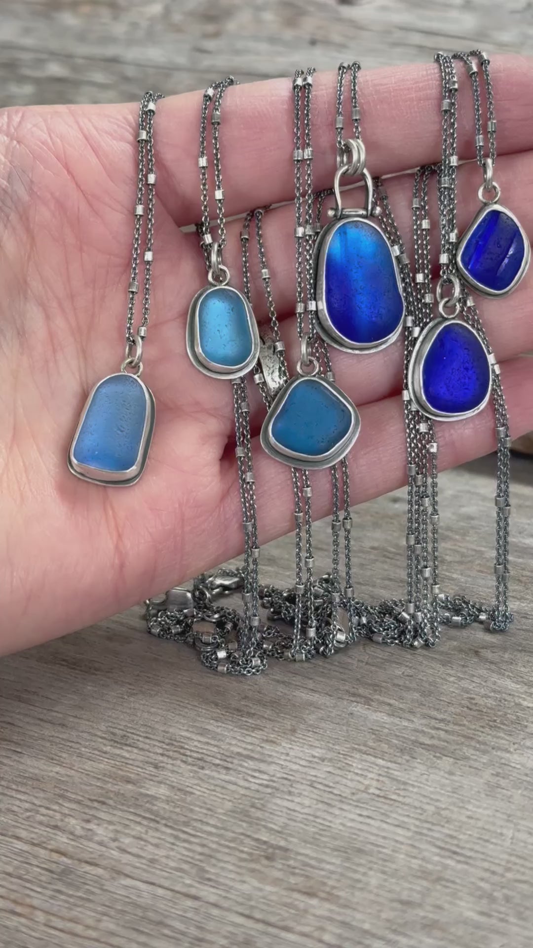 These elegant blue pendants feature beautiful genuine sea glass in various shades of blue.  They were found by a reputable beach combers in England, Spain and Scotland, and by me in Oregon and on Vancouver Island, Canada.