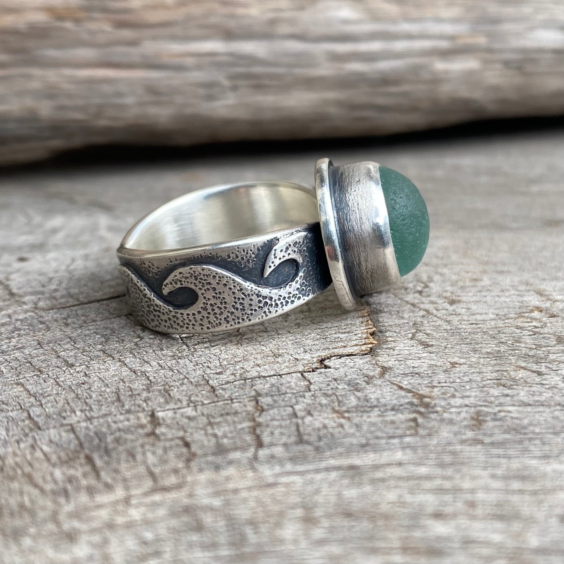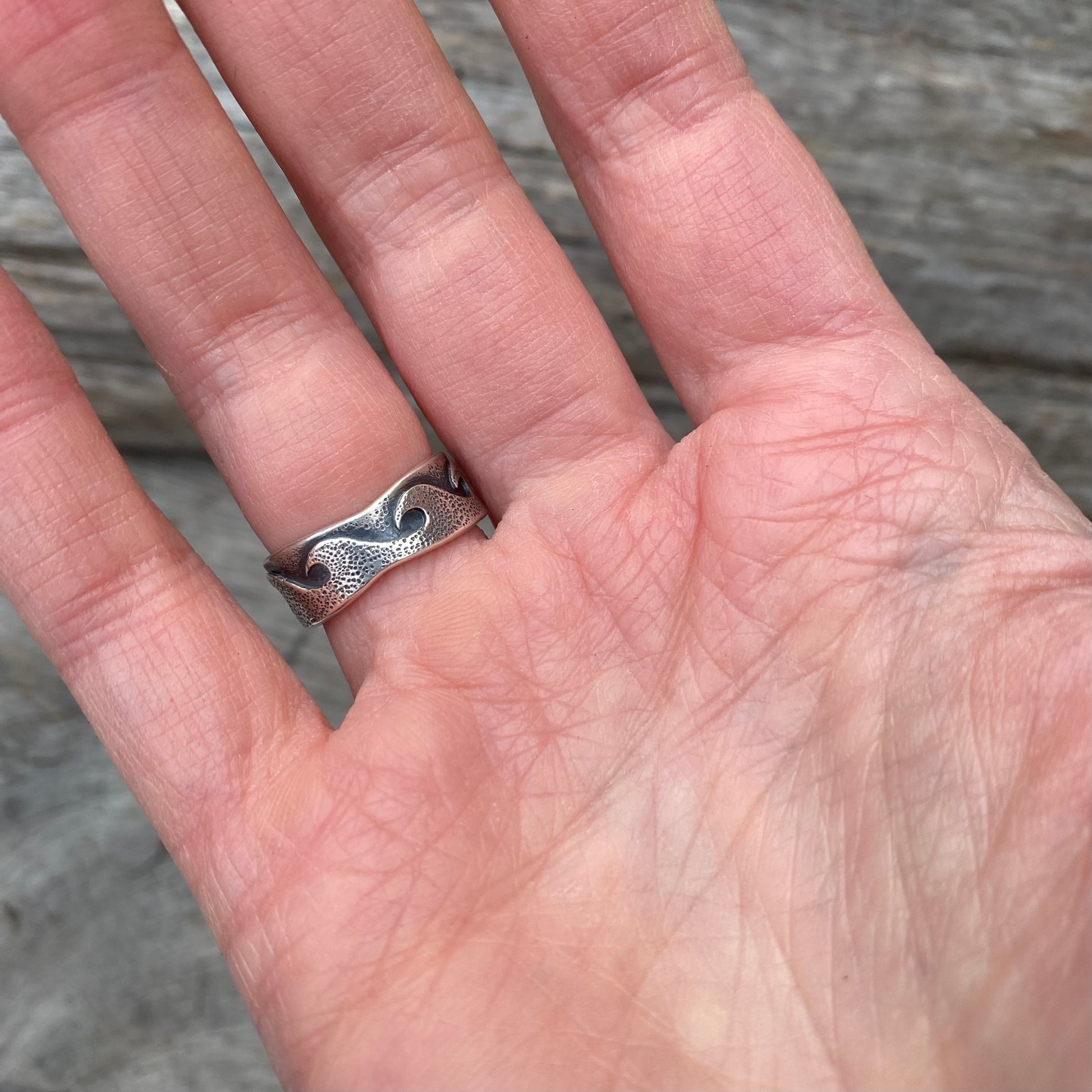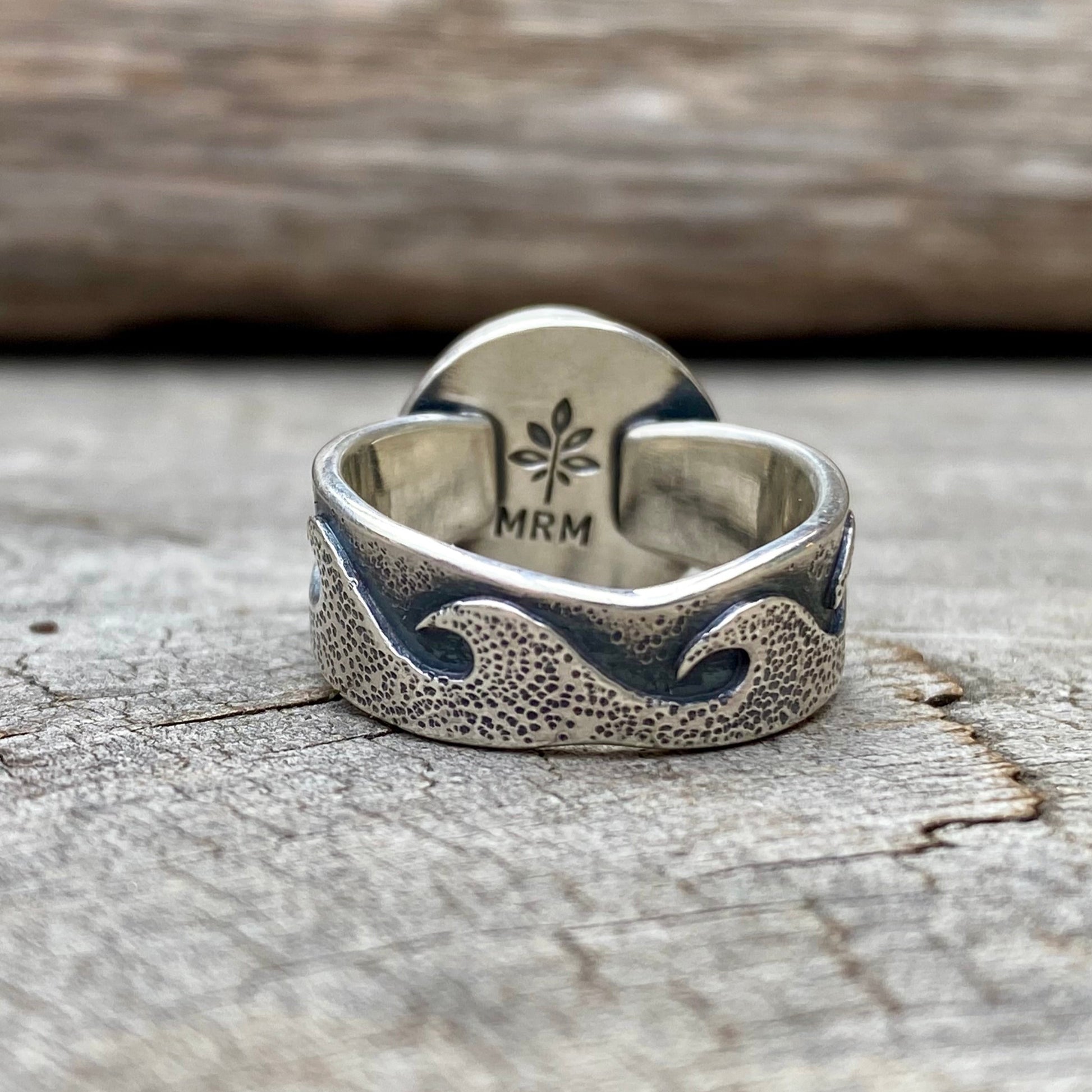 This ring was completely handcrafted from sterling and fine silver. The wave detailing on the band was hand drawn, sawn out of sterling silver sheet, textured by hand, and oxidized to bring out all the little details. If you aren't traveling this year, you can still enjoy a beautiful ocean view when you look down at your finger.