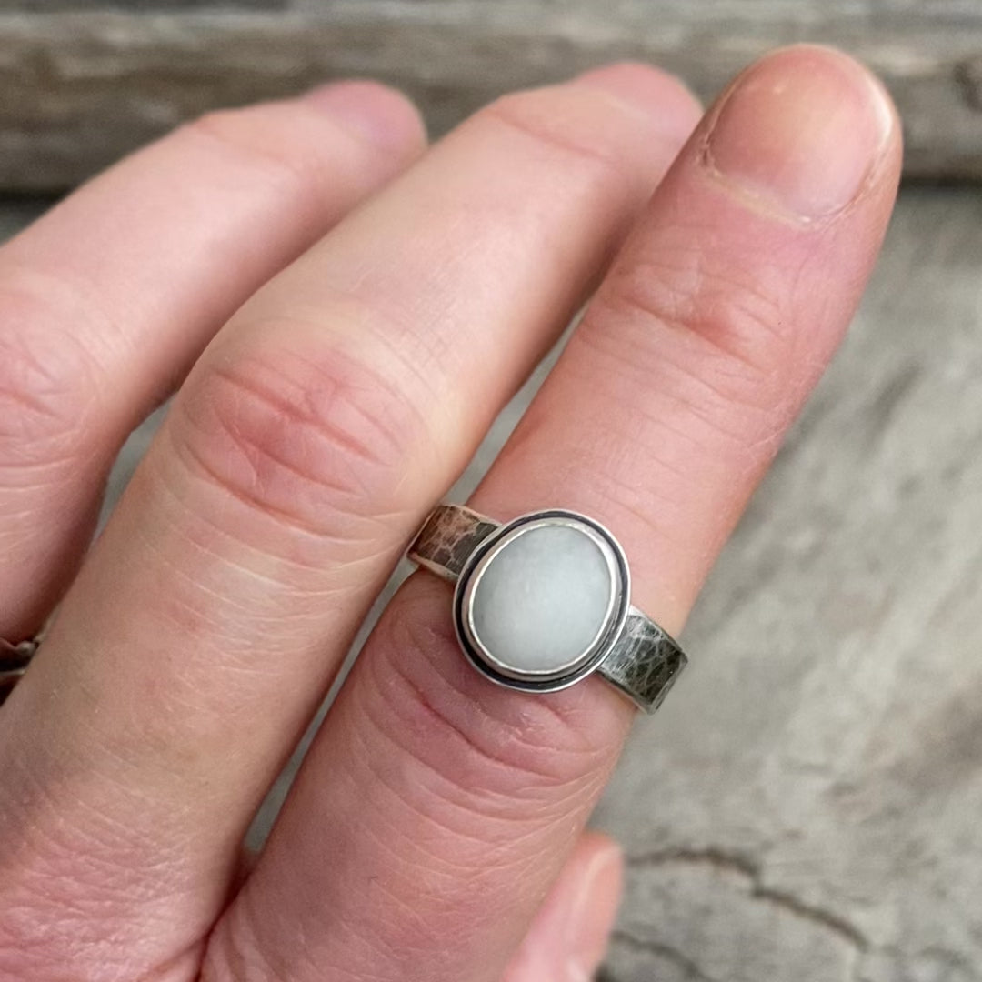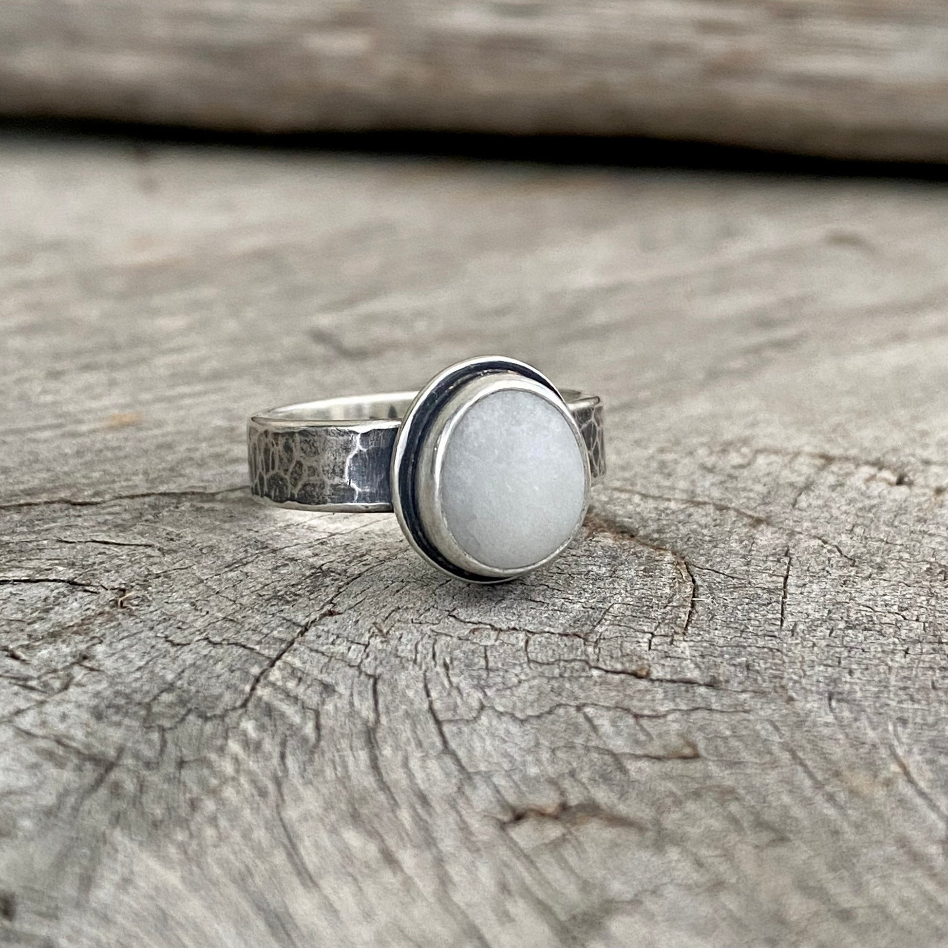 Perfect for someone who loves to collect stones by the sea shore, this ring features a beautiful white (most likely quartz) Vancouver Island beach stone, collected by me, and naturally tumbled and shaped by the ocean.