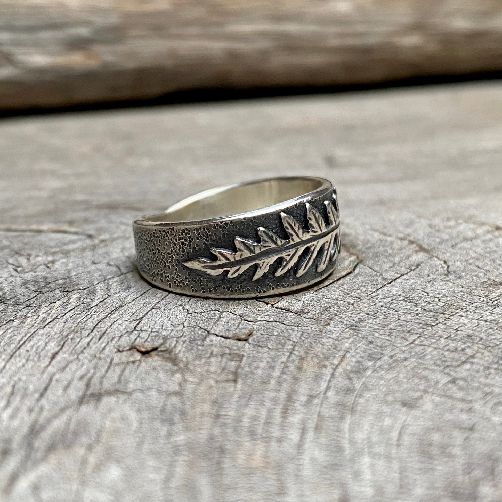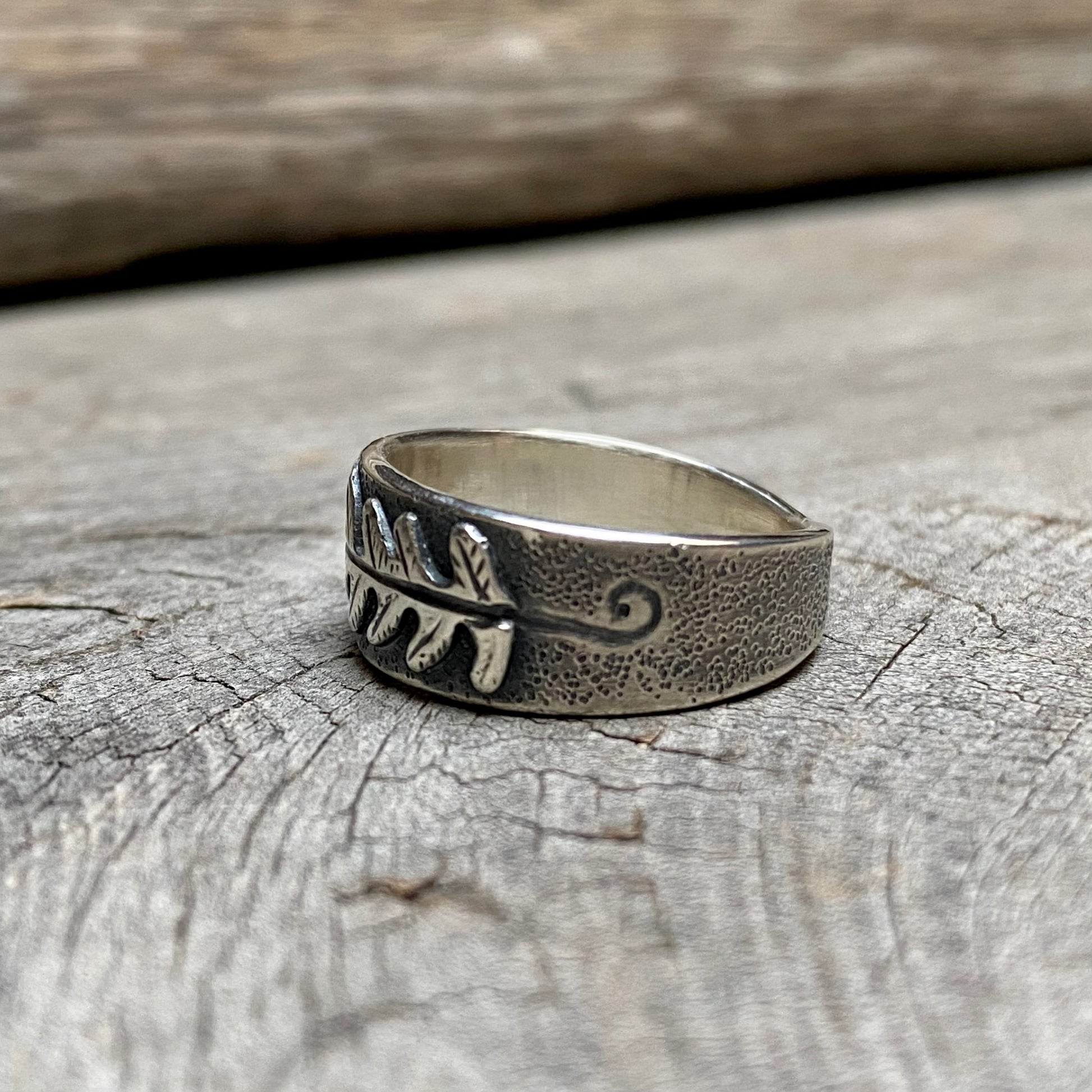 This sterling silver ring band features a sweet little lady fern that was hand sawn and textured from a real lady fern leaf that I collected on one of my forest walks.