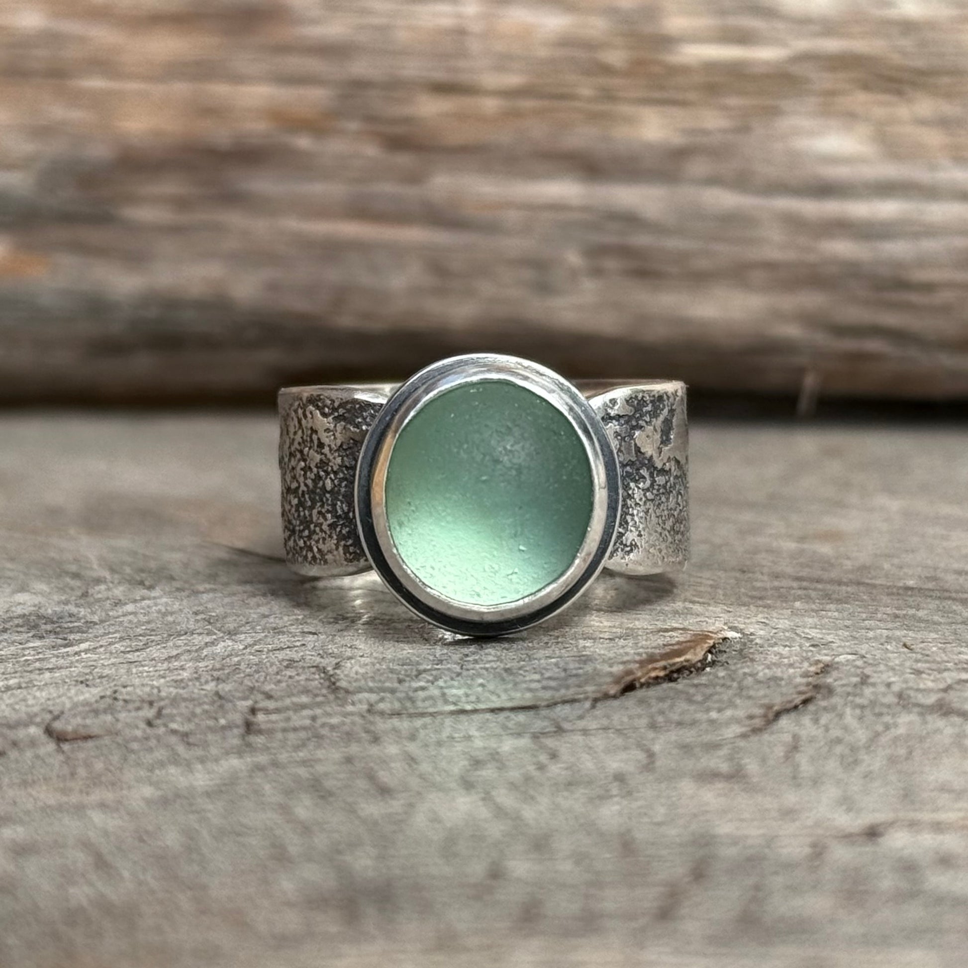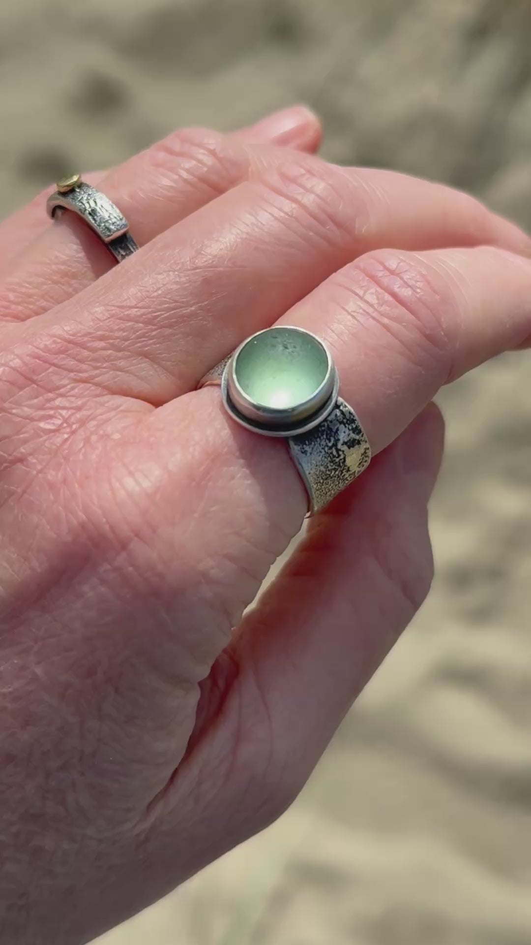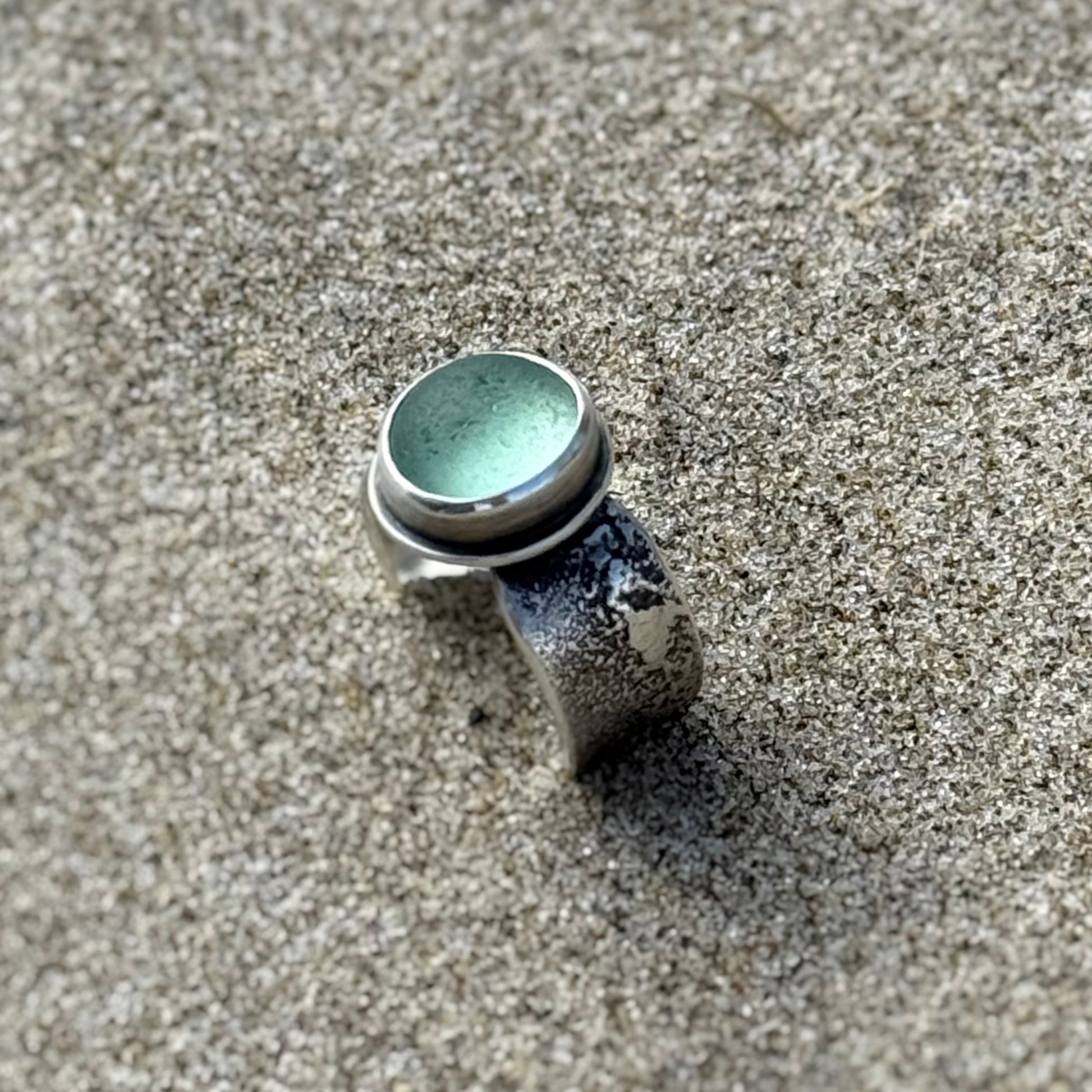 Crafted with a thick, sterling silver band and setting, this ring is made to last a lifetime. The “sandy” texture, created with silver dust and fire, evokes the beauty of the seashore—rugged yet polished, just like the coast itself.