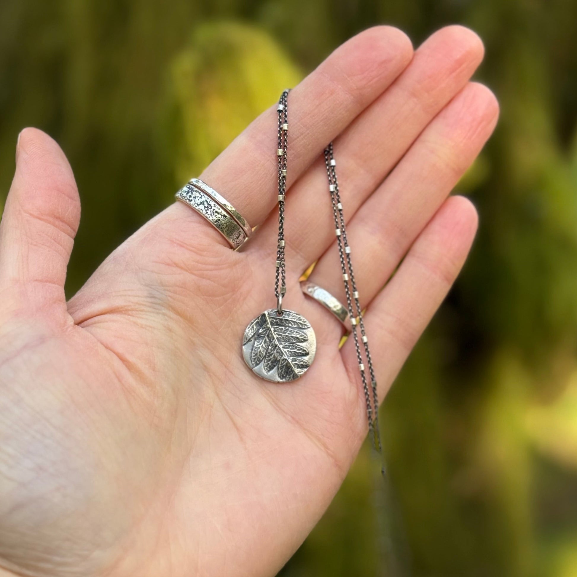Completely handcrafted in sterling silver, this pendant was created from an impression of a licorice fern that I collected, on one of my many forest walks, along the Oregon Coast.