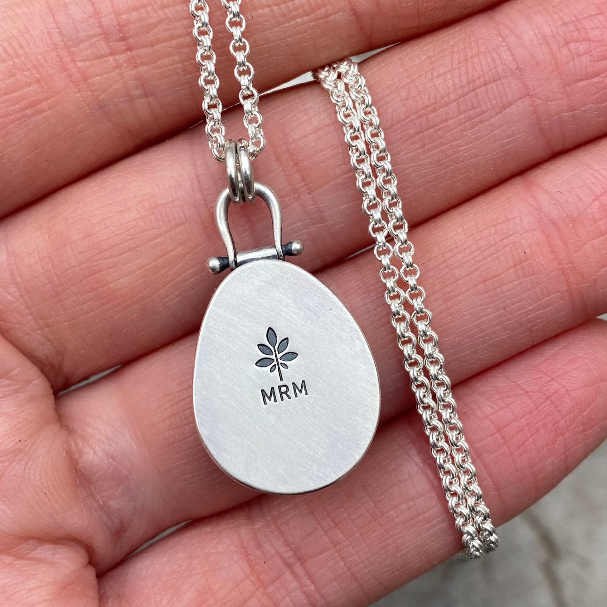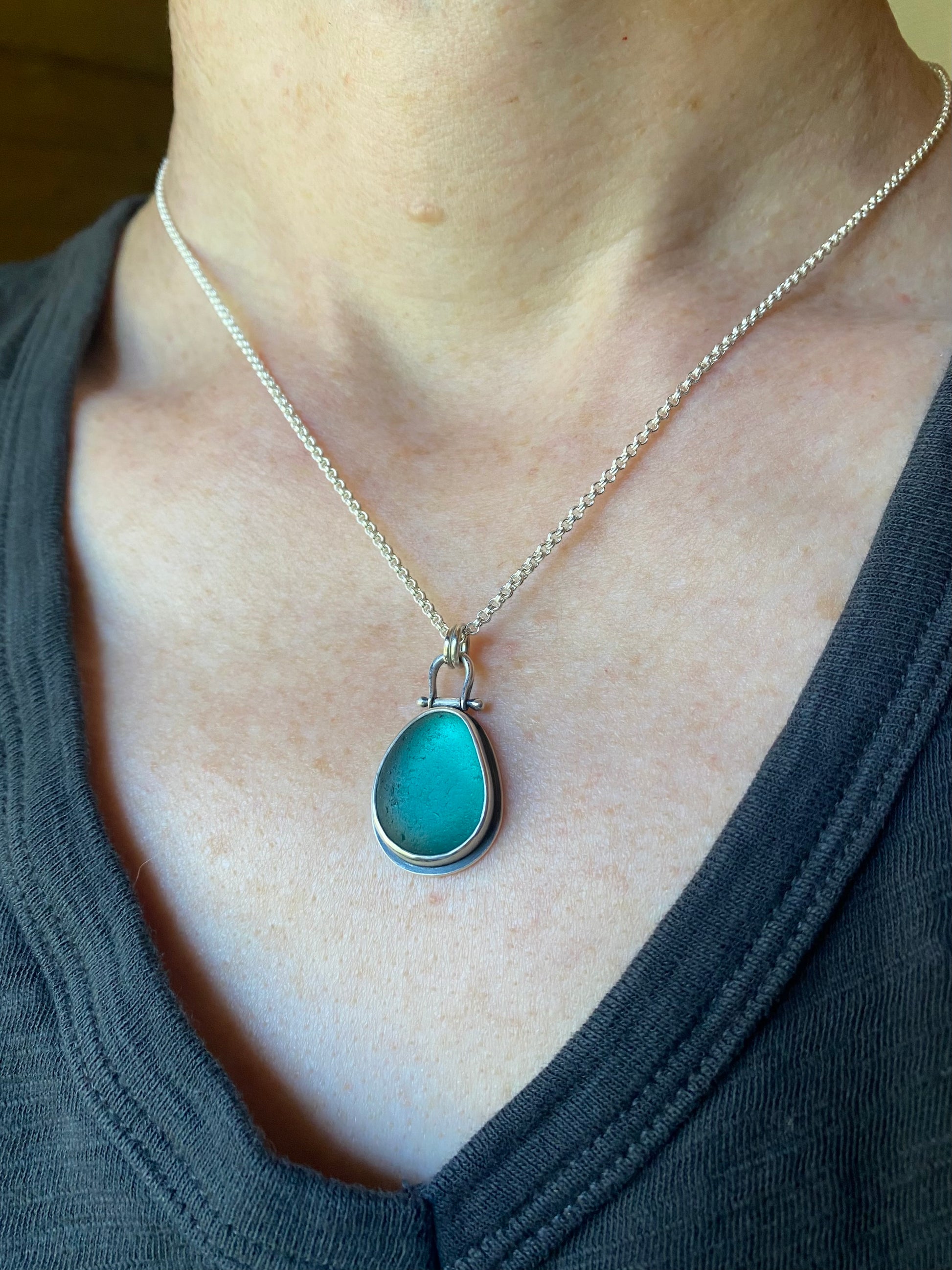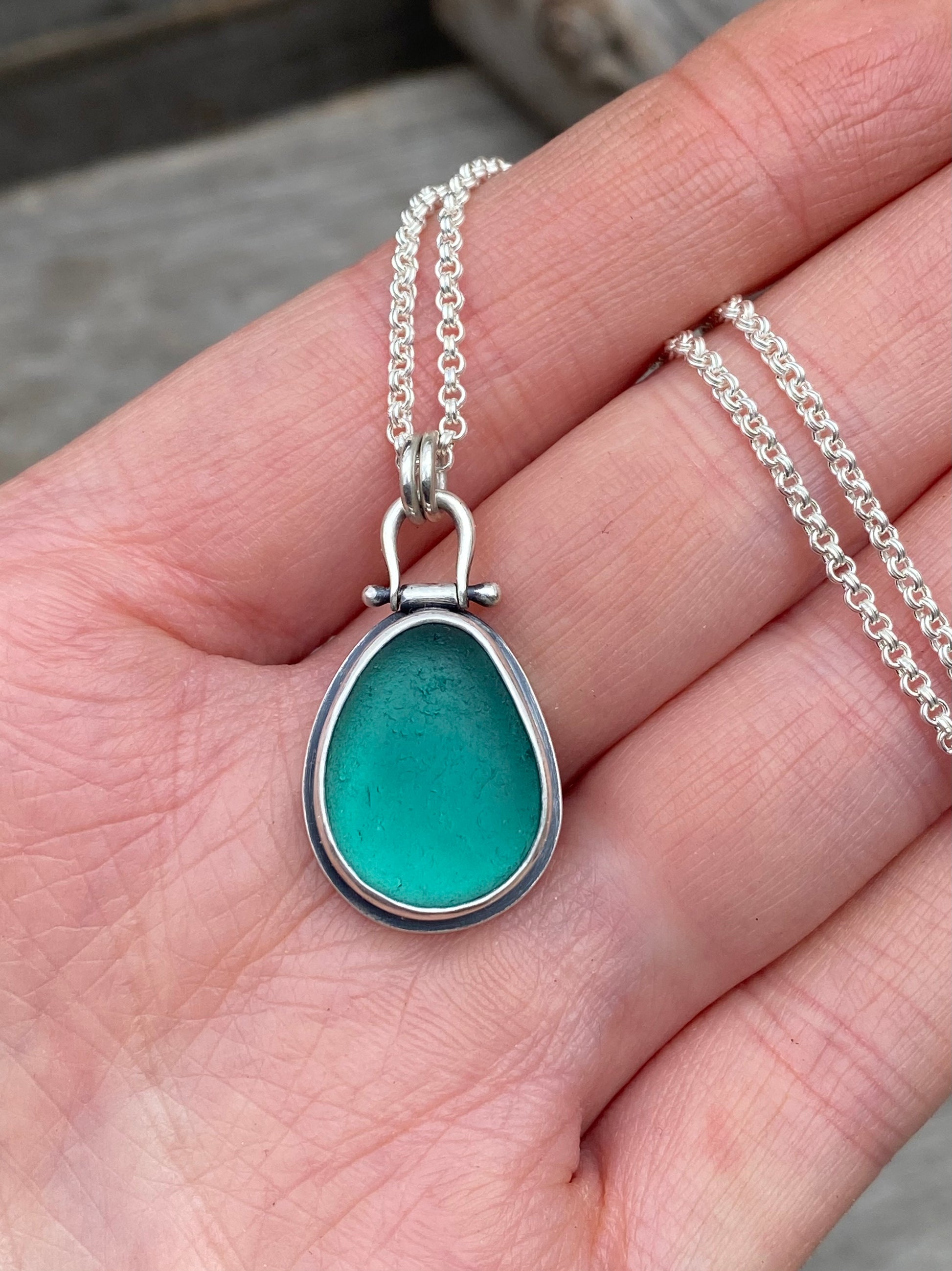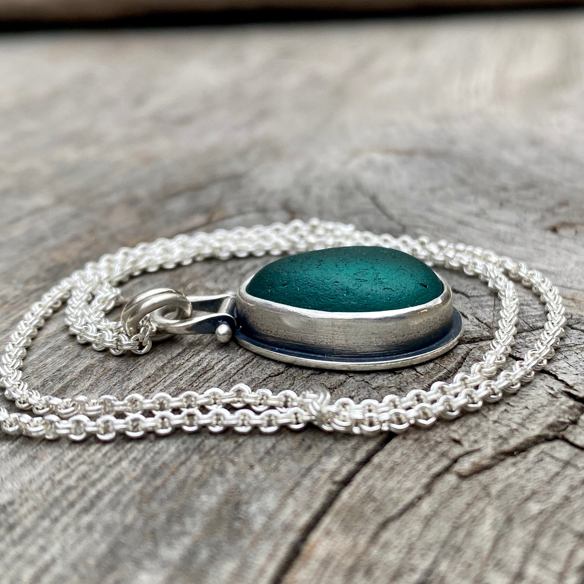 The sea glass is set in fine silver and rests on a sterling silver back plate that features my makers mark. It hangs from a completely hand made heat pinned bail. The pendant has been oxidized to contrast the stunning glow of the glass.