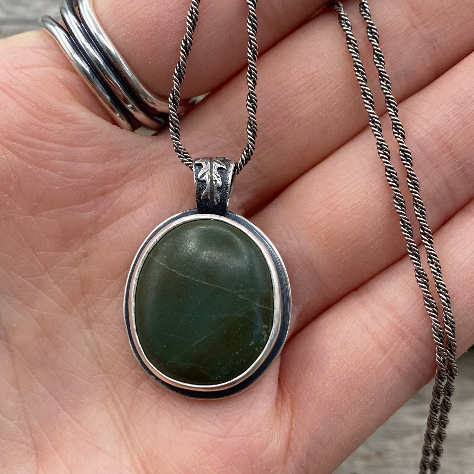 This pendant features a beautiful piece of jasper that I found on Vancouver Island. Made of fine and sterling silver, the pendant features an intricately hand sawn lady fern leaf detailing on the bail.