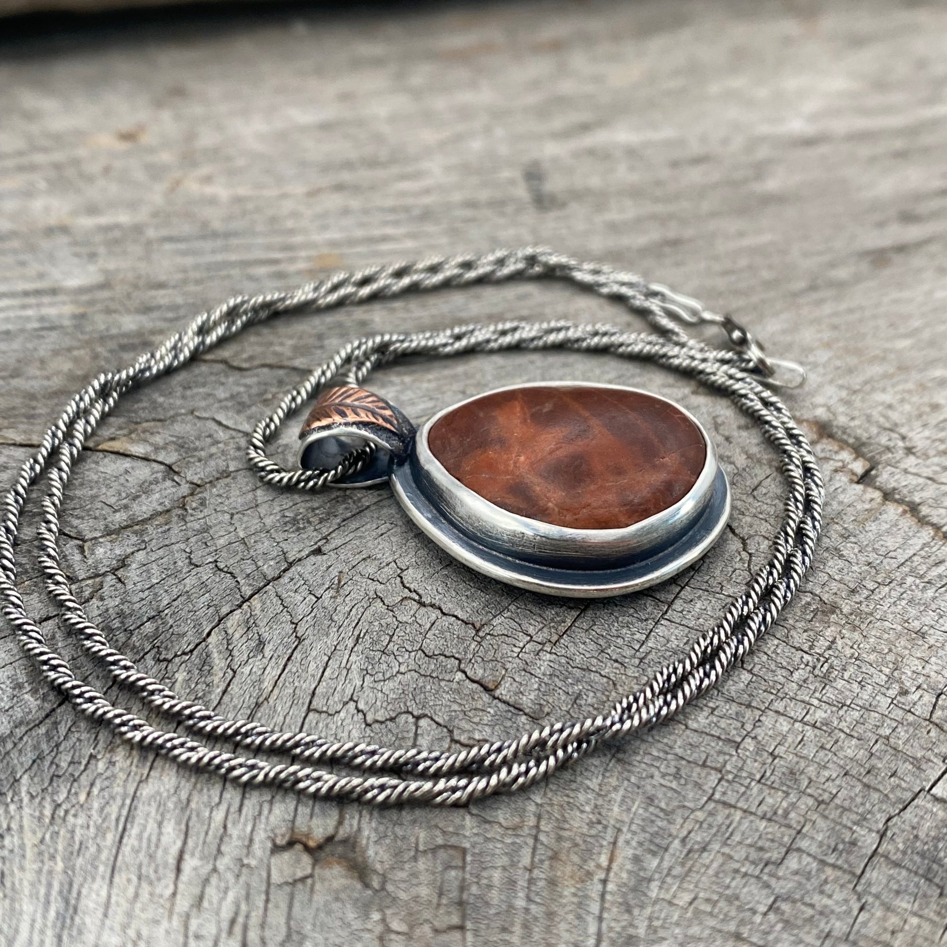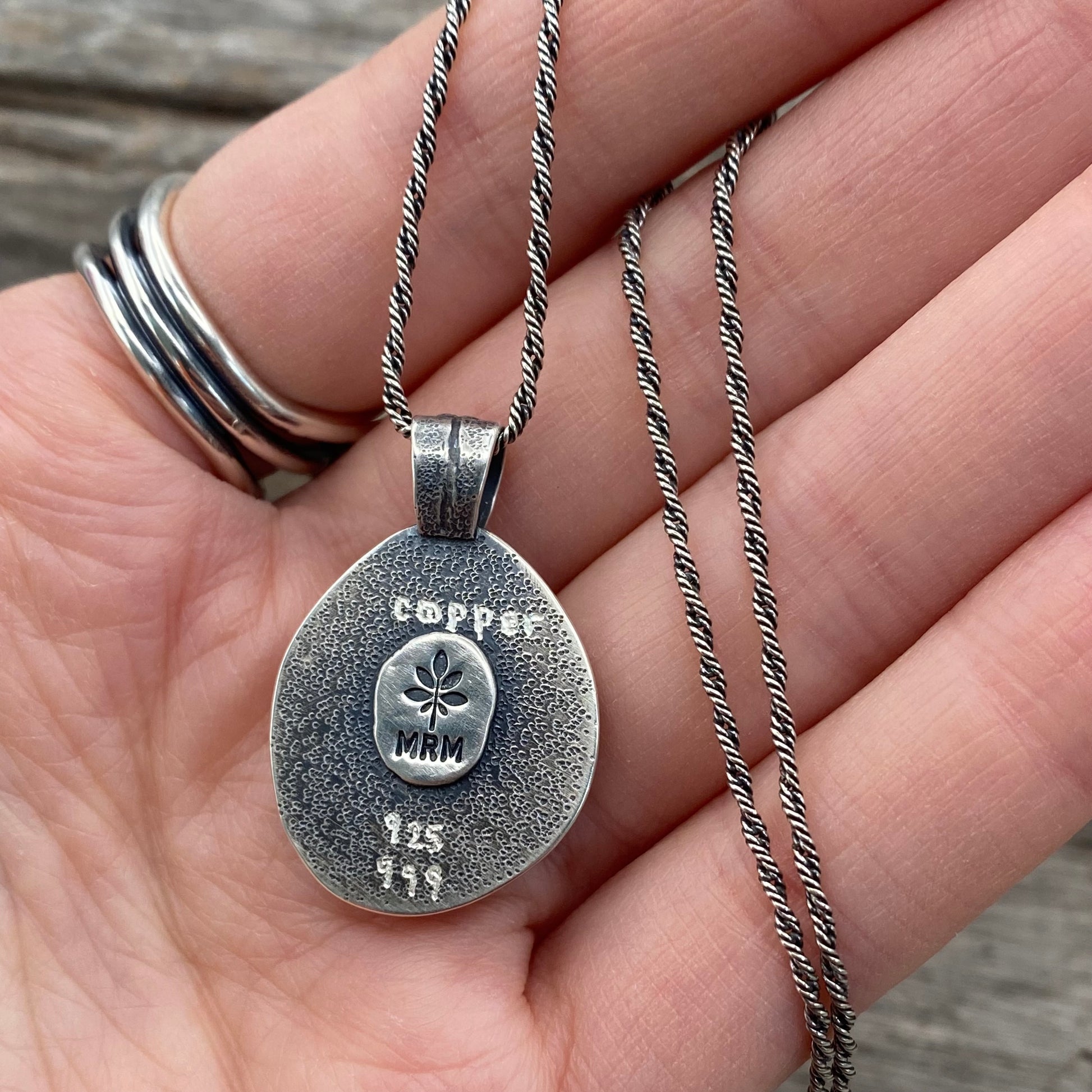 Pendant: heavy 18 gauge sterling silver back plate, heavy 22 gauge fine silver bezel, copper leaf