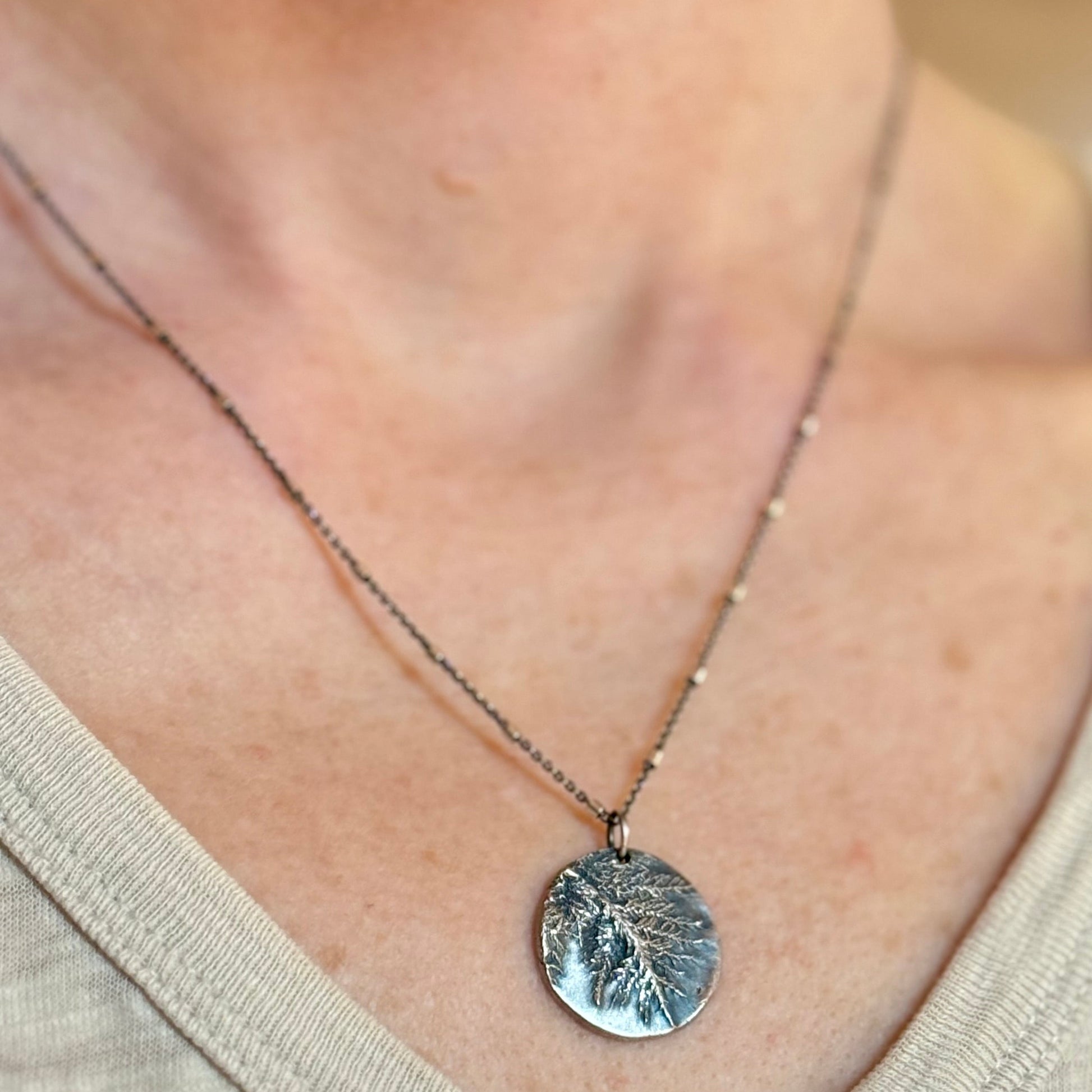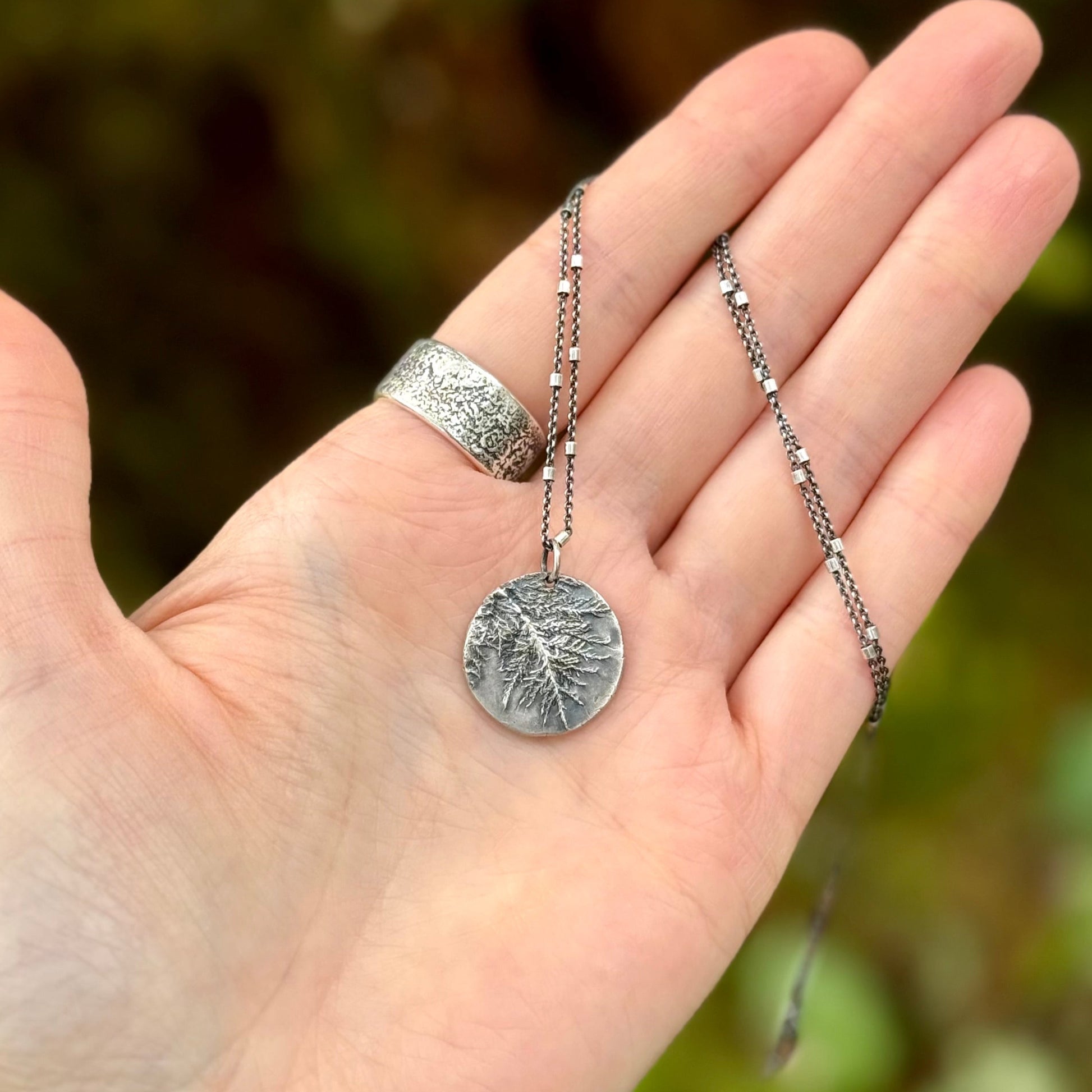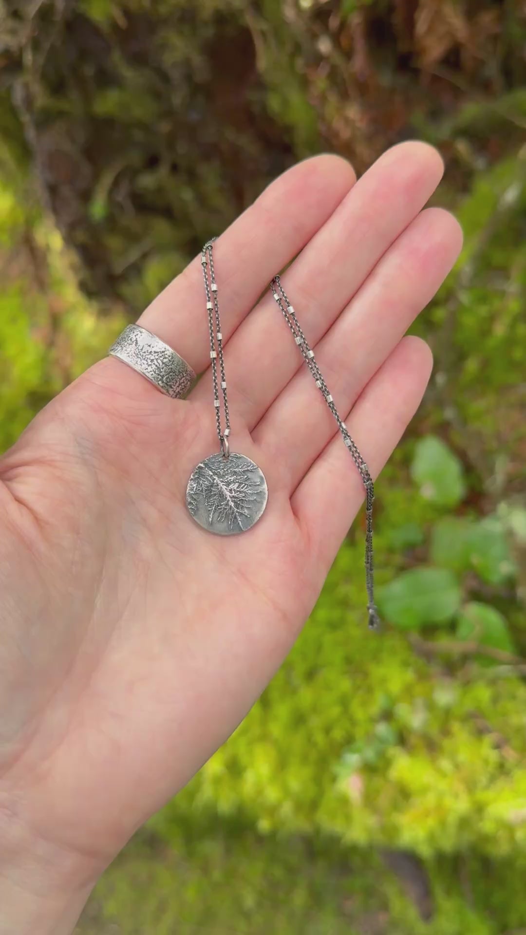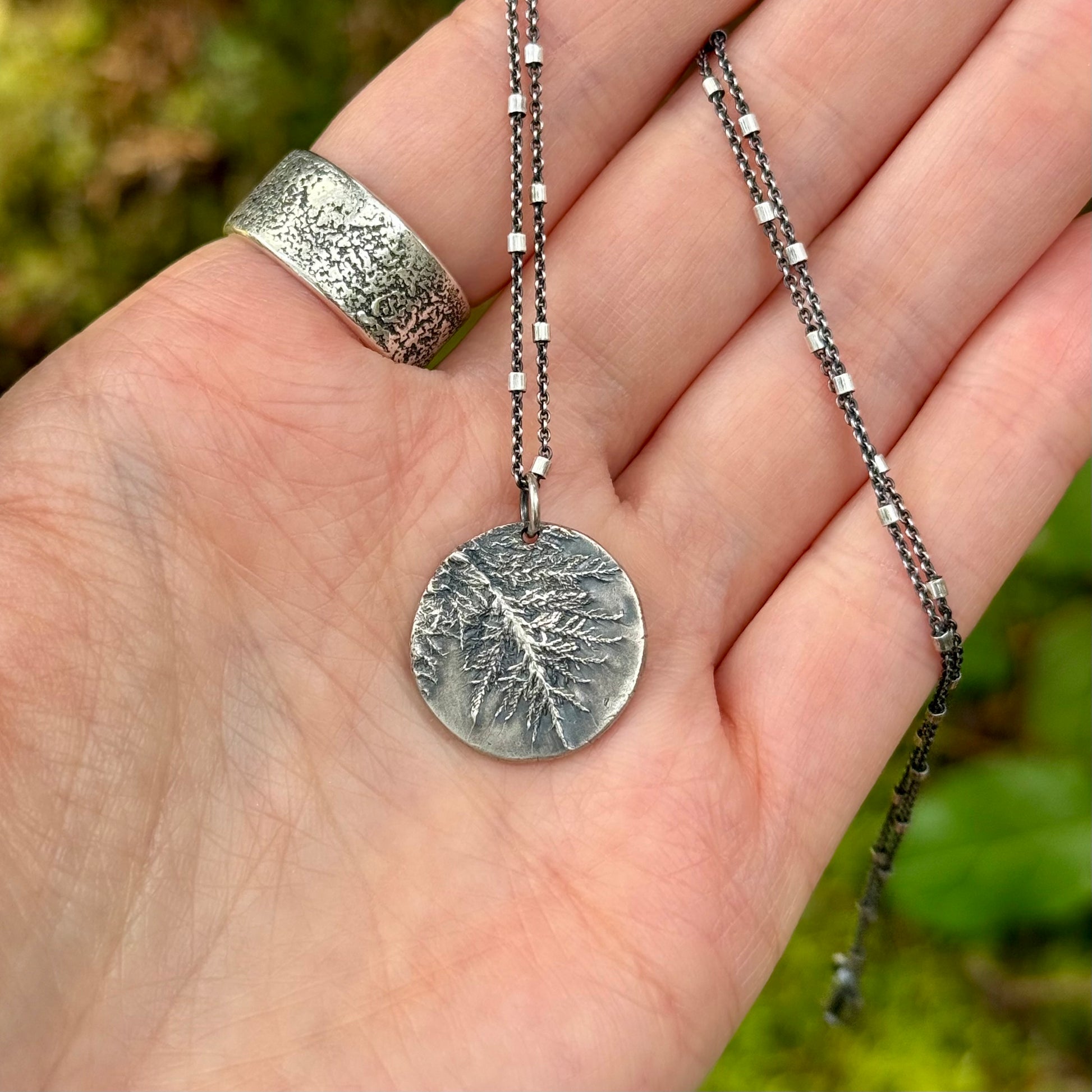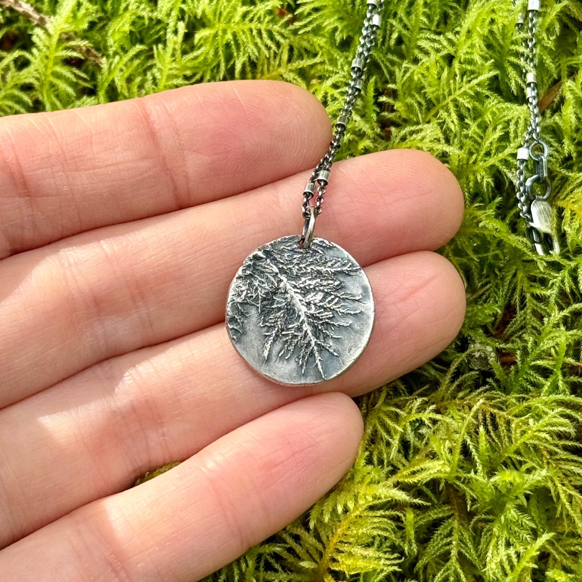 This sterling silver pendant is made from an impression of Glittering Wood Moss that I gathered on one of my walks, through the misty forests of the Oregon Coast—a place where time moves differently, and peace feels just a little easier to find.