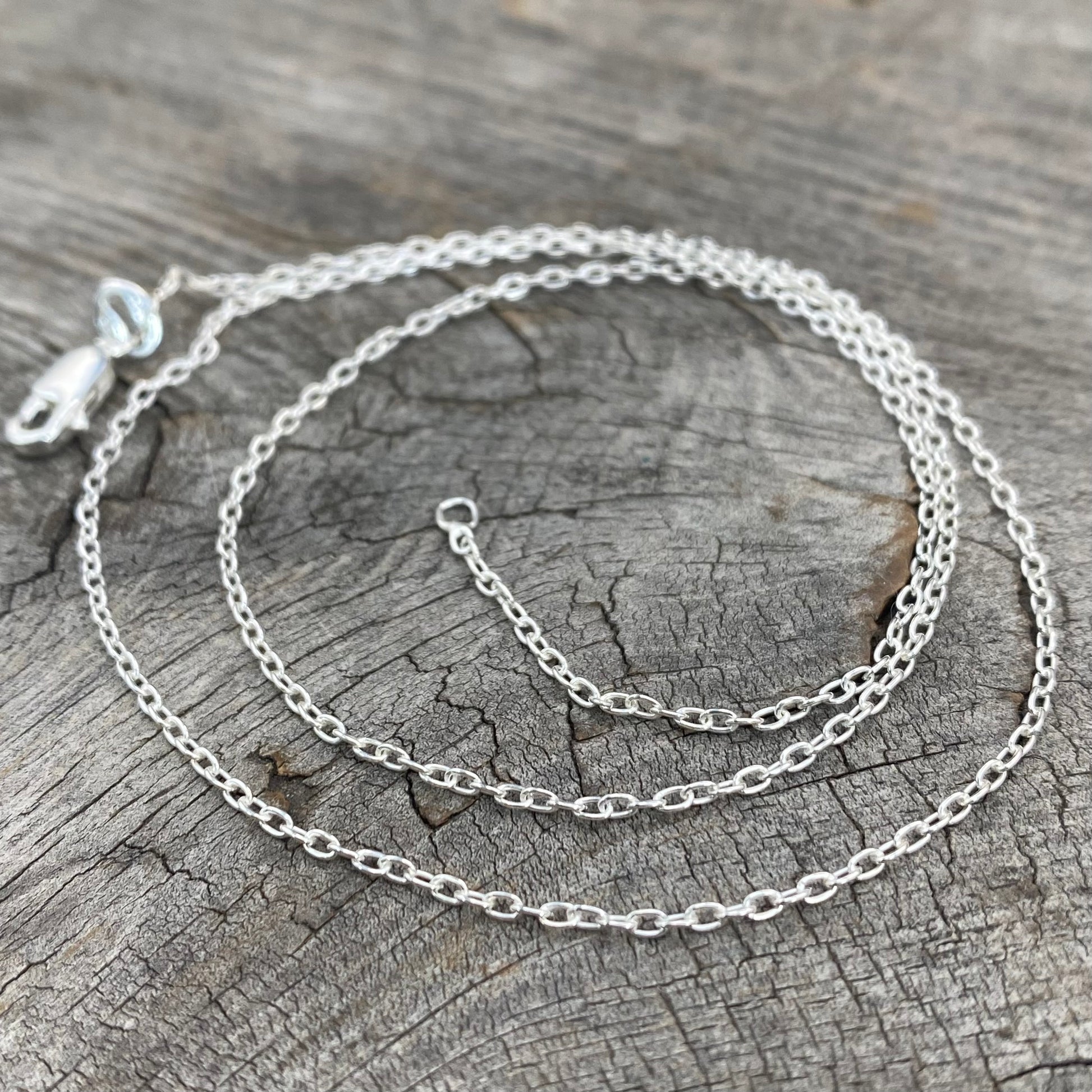 This solid sterling silver elongated cable chain is a lighter weight chain. Although it is more on the delicate side, it is still strong.