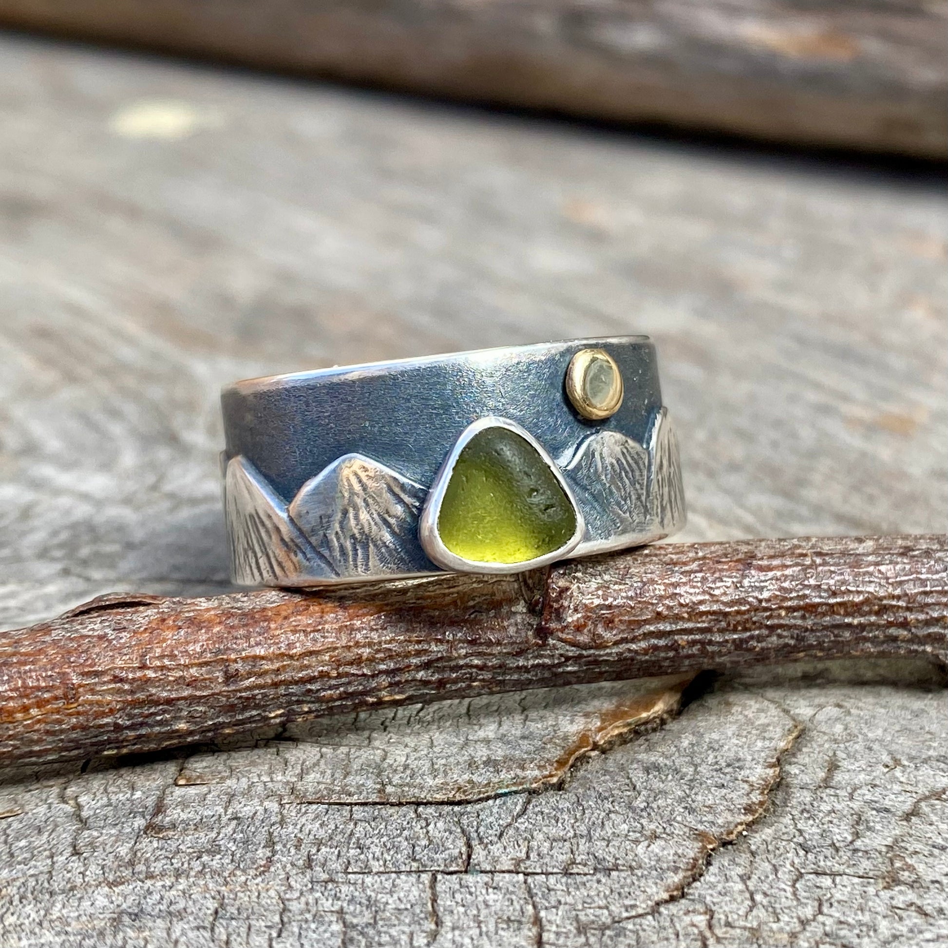 (Reserved for V Payment 1 of 2) Vancouver Island sea glass mountain ring with 18k gold moon