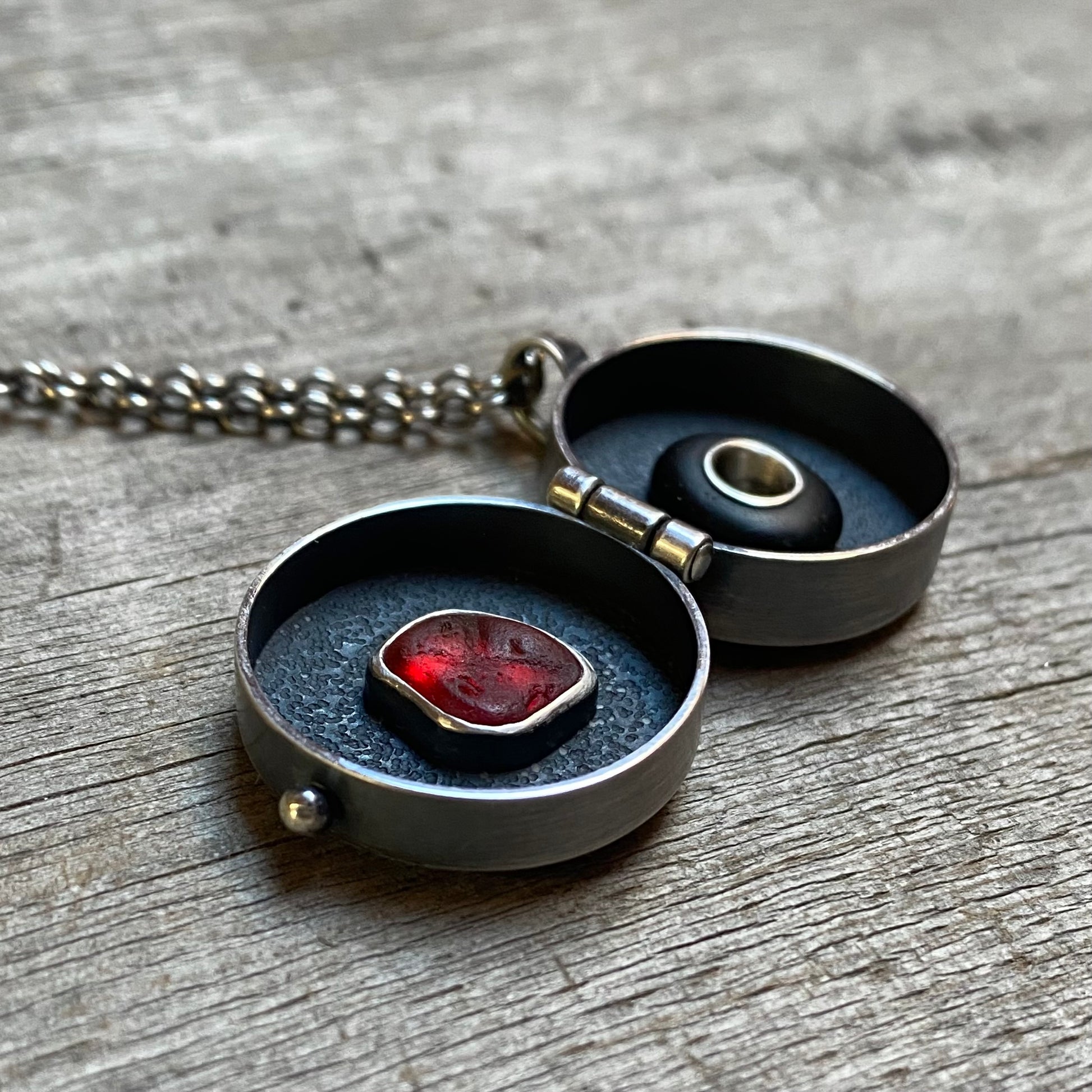 Upon opening the locket you will see a very special piece of red English sea glass which has a naturally occurring "X" in the sea glass.