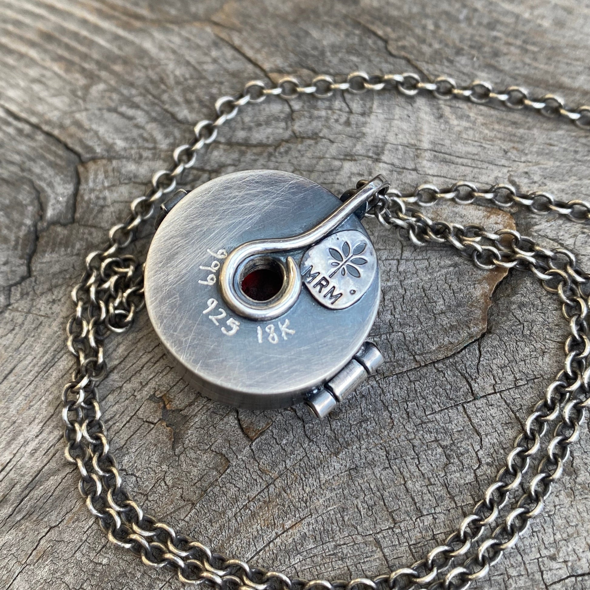 The back of the locket has the metal materials hand engraved around the curved bail along with my maker's mark, stamped in recycled fine silver.