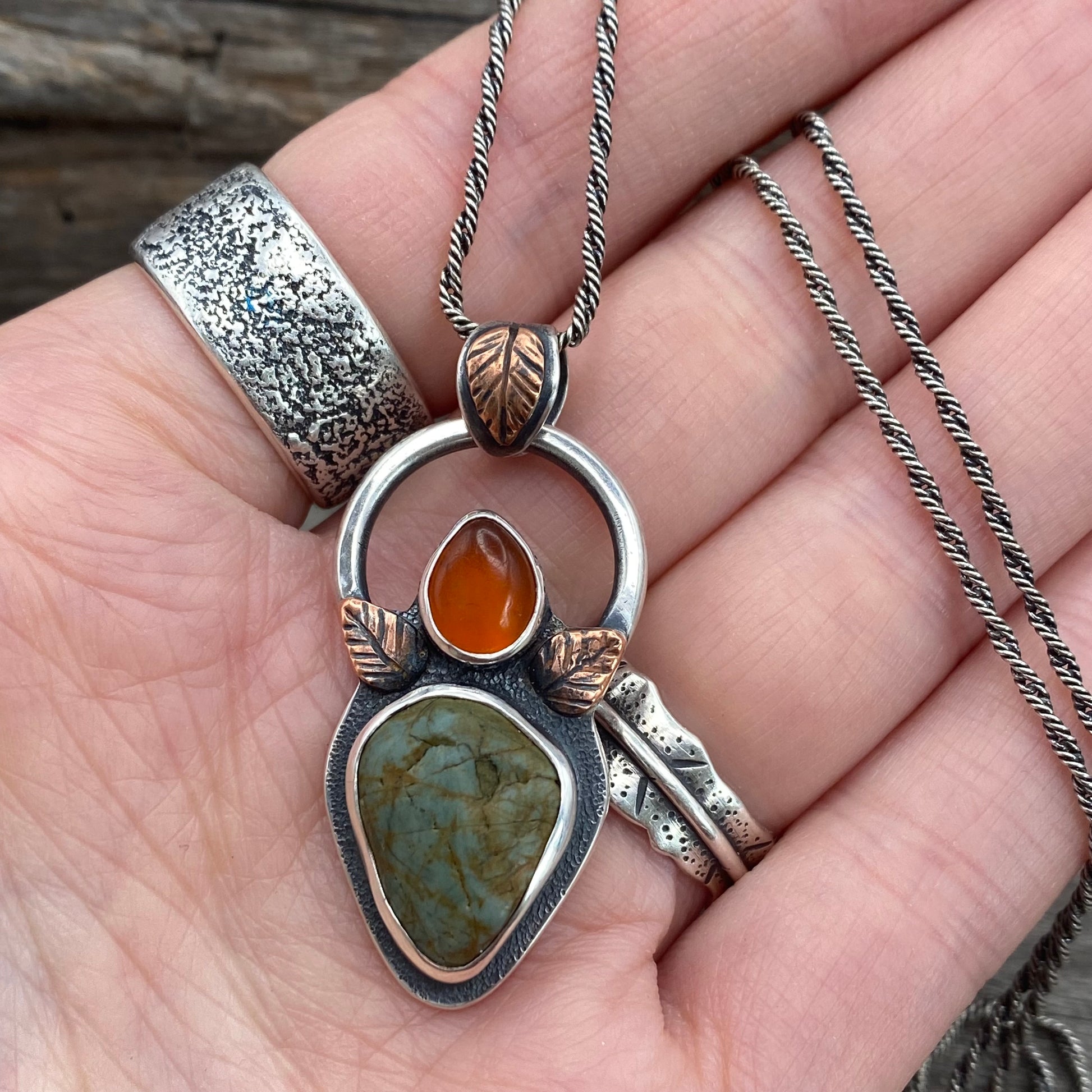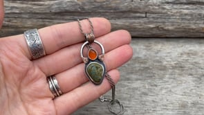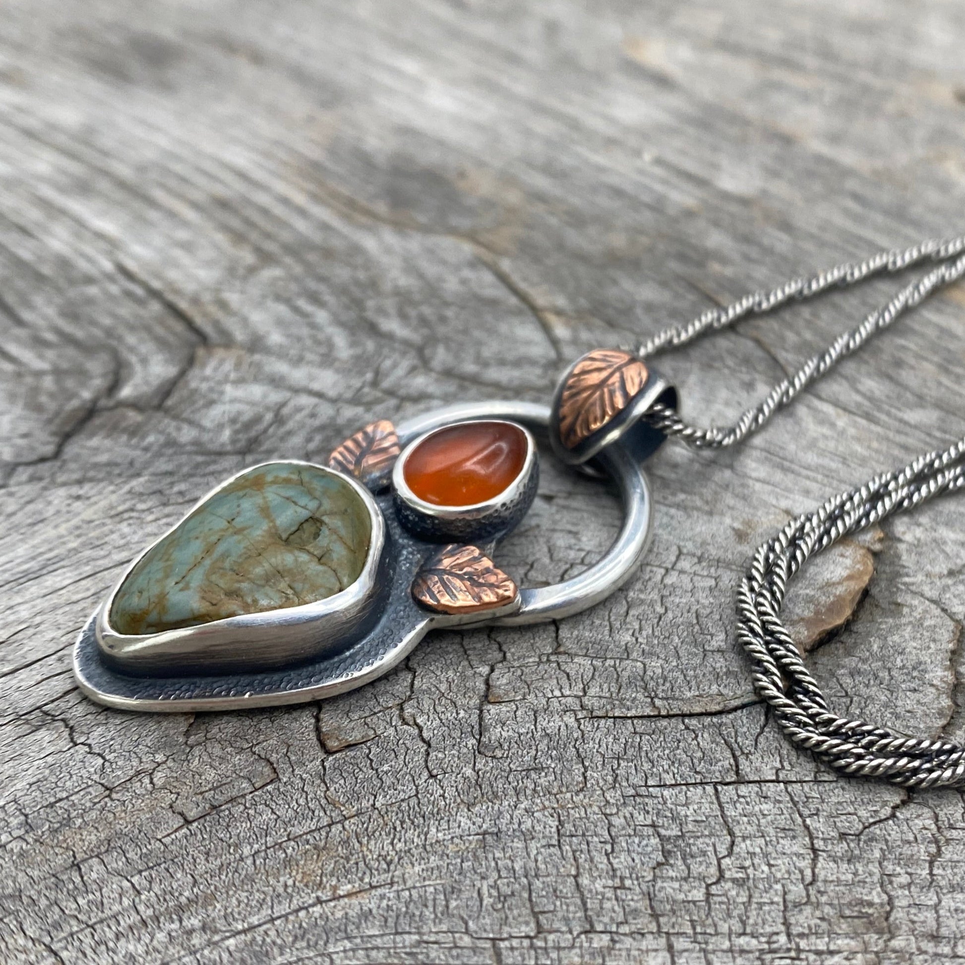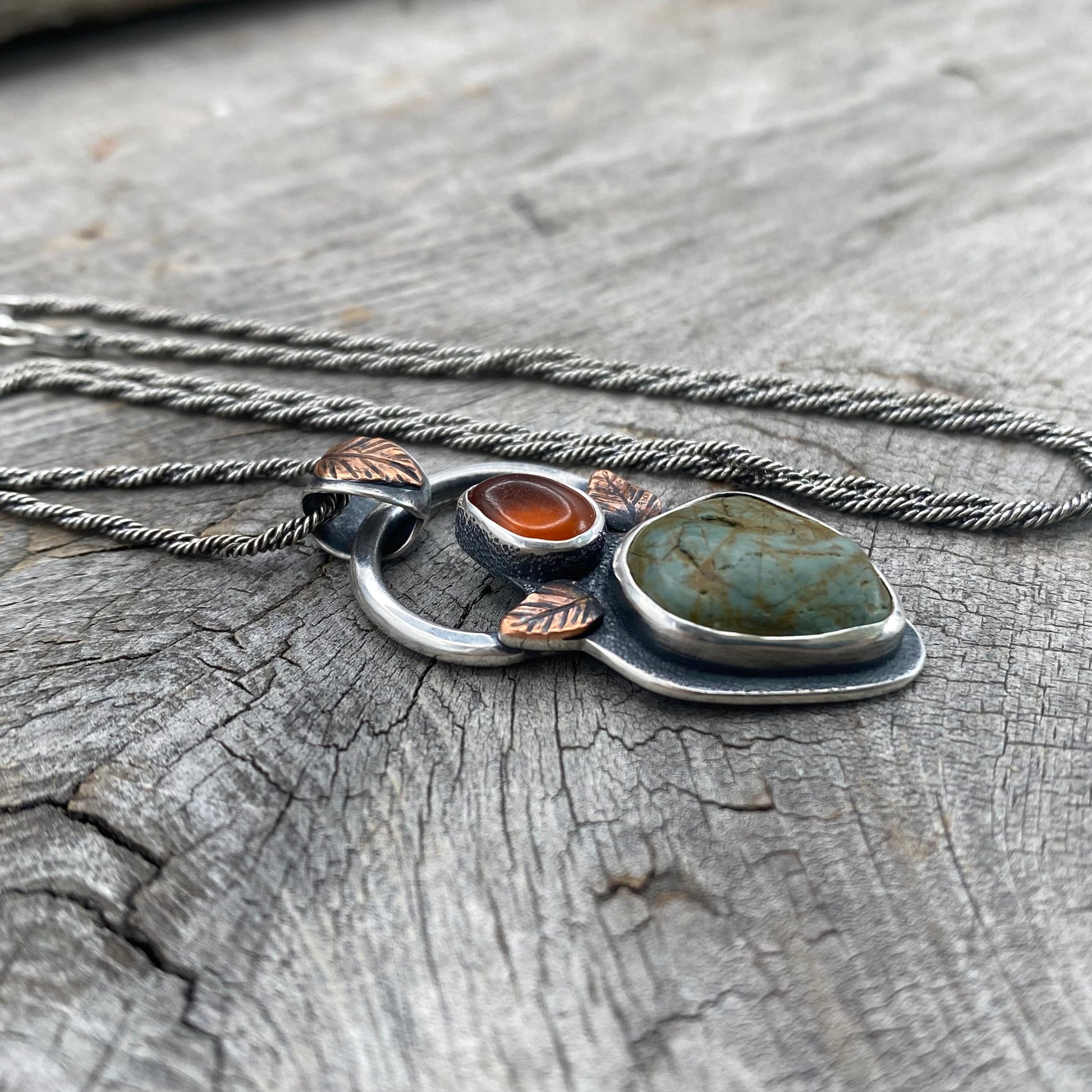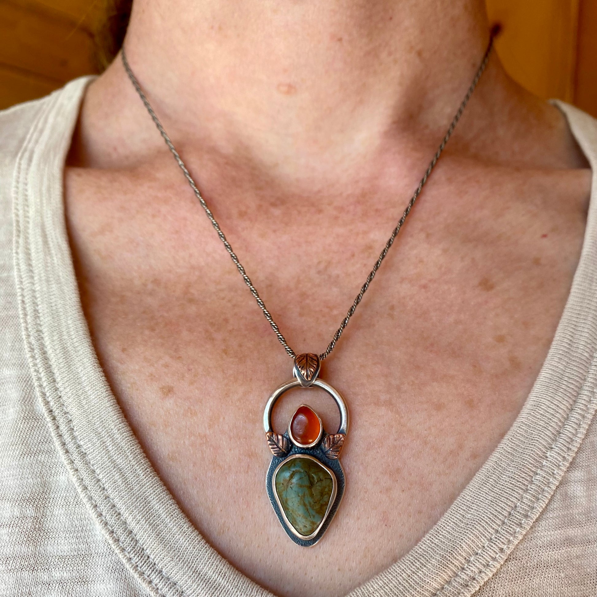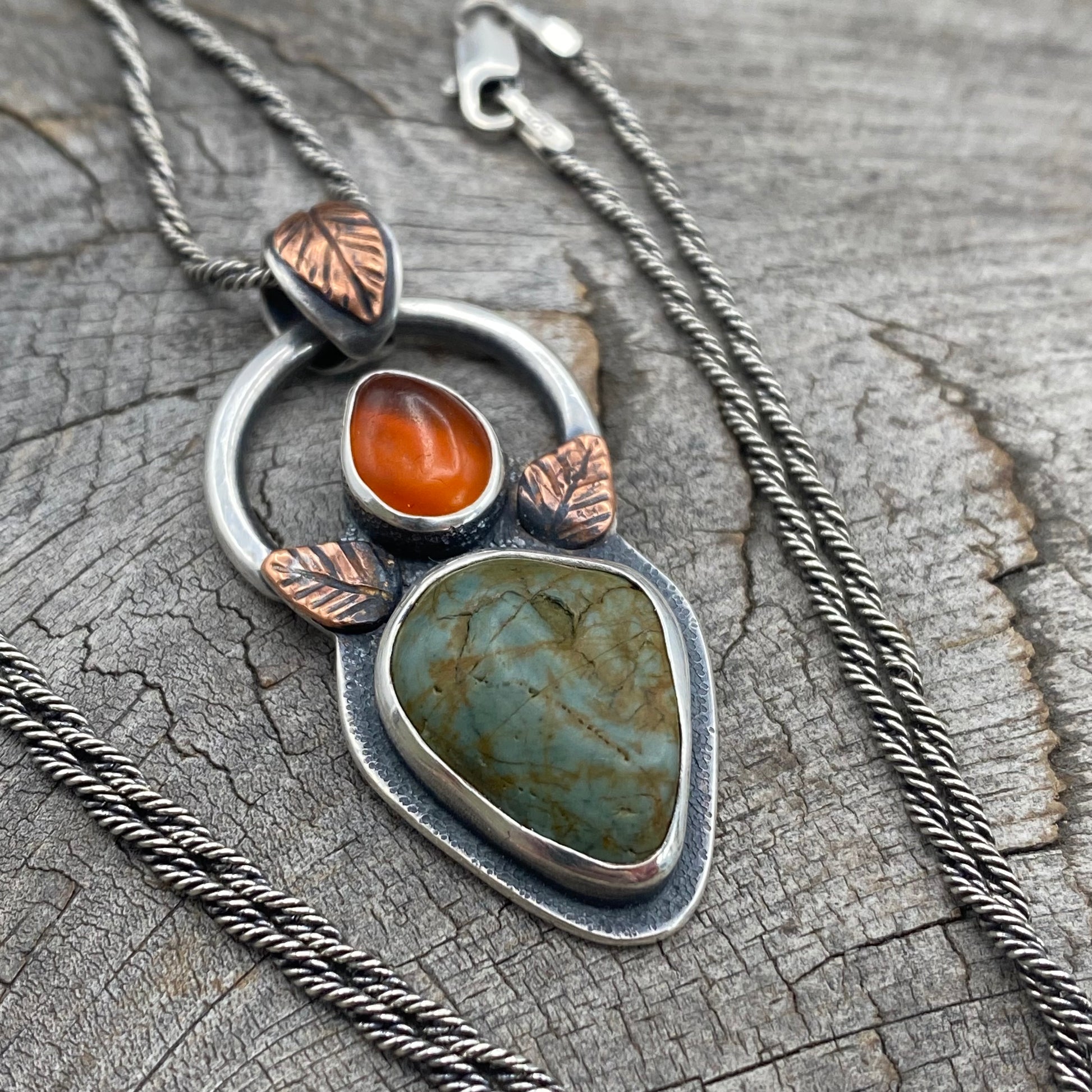 Made of fine and sterling silver, and copper, this burnt orange carnelian and green jasper pendant encompasses autumn in beach stones.