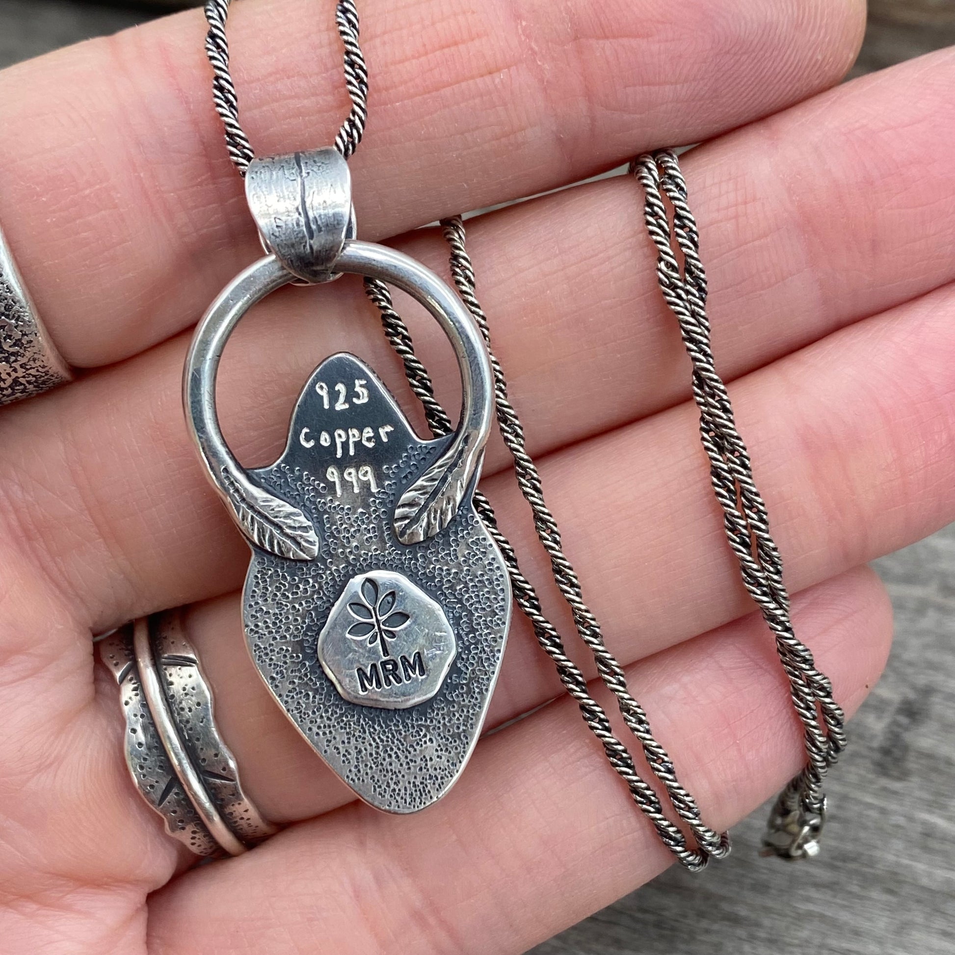 The back of the pendant features hand carved silver leaves along with my makers mark and hand engraved metal qualities.