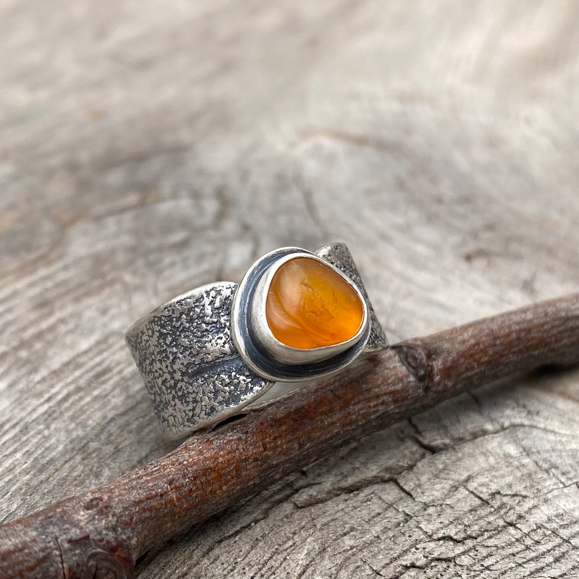 I have textured this band by fusing silver dust to add a beautiful sandy texture.  This texture holds the patina very well over time.