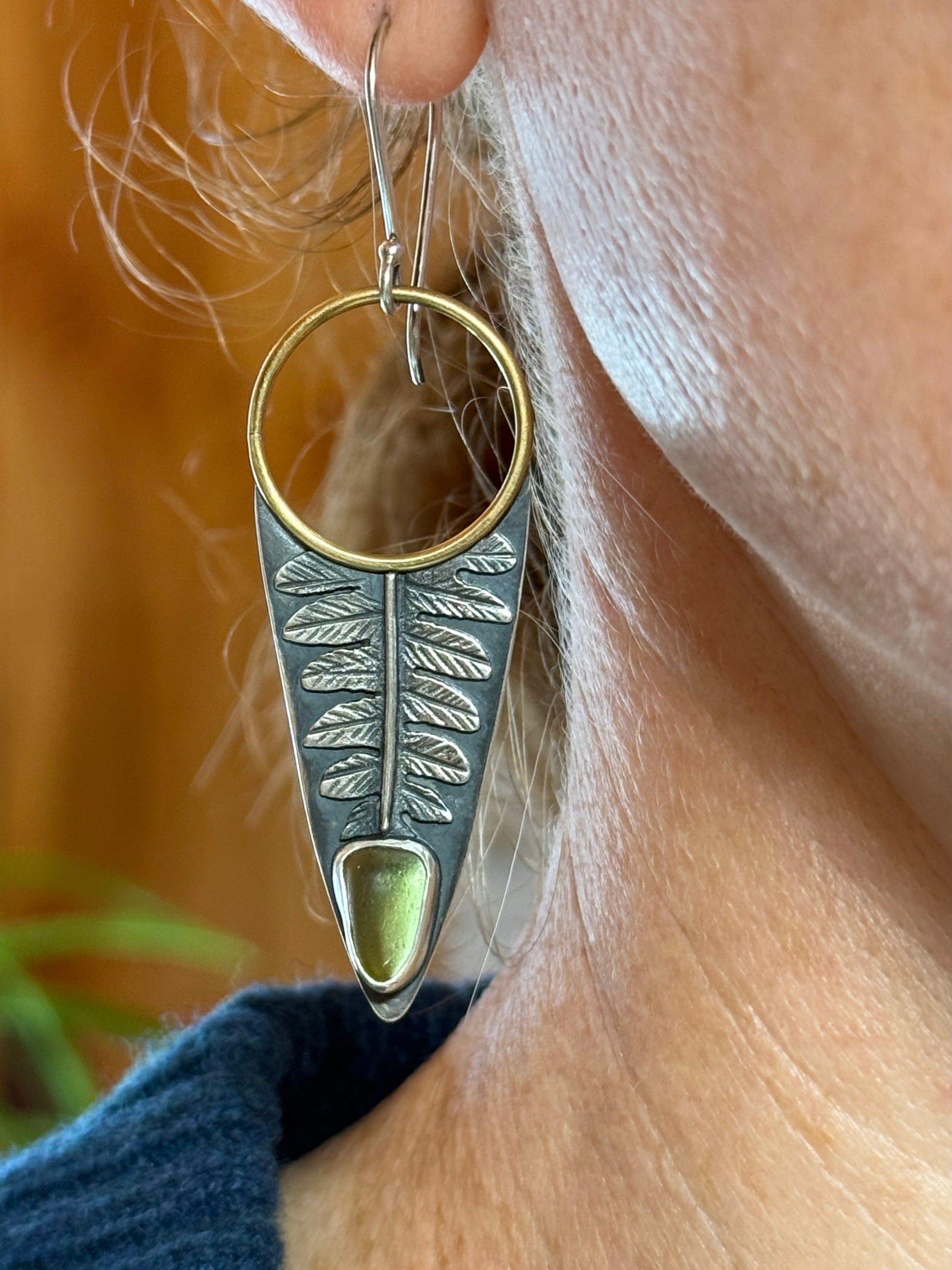 Olive green Vancouver Island sea glass is set below hand sawn Oregon deer ferns that I collected from one of my many forest walks.