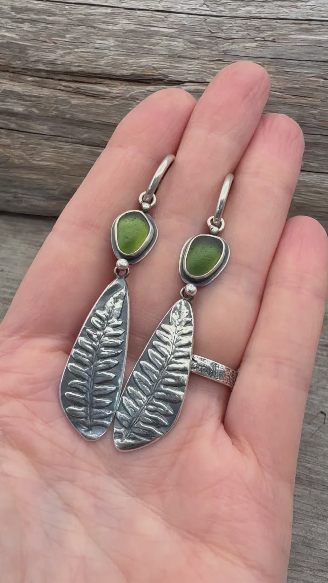 Forest green Vancouver Island sea glass hangs from sterling silver hoop earrings.  Below the sea glass, hang silver imprints of an Oregon lady fern that I collected on one of my many forest walks.