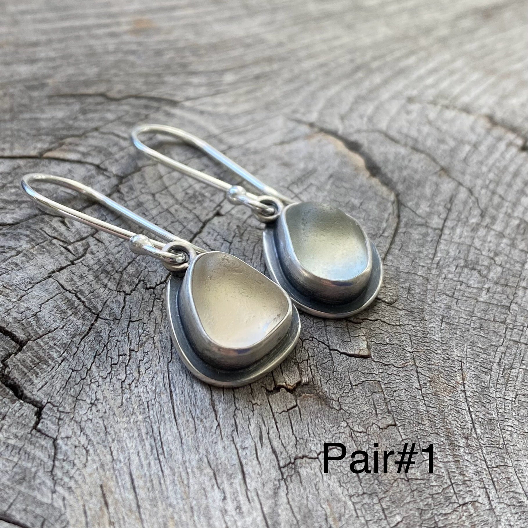 These pairs of sterling silver dangle drop earrings feature glowing winter white Vancouver Island sea glass set in sterling and fine silver with hand made sterling silver ear hooks.