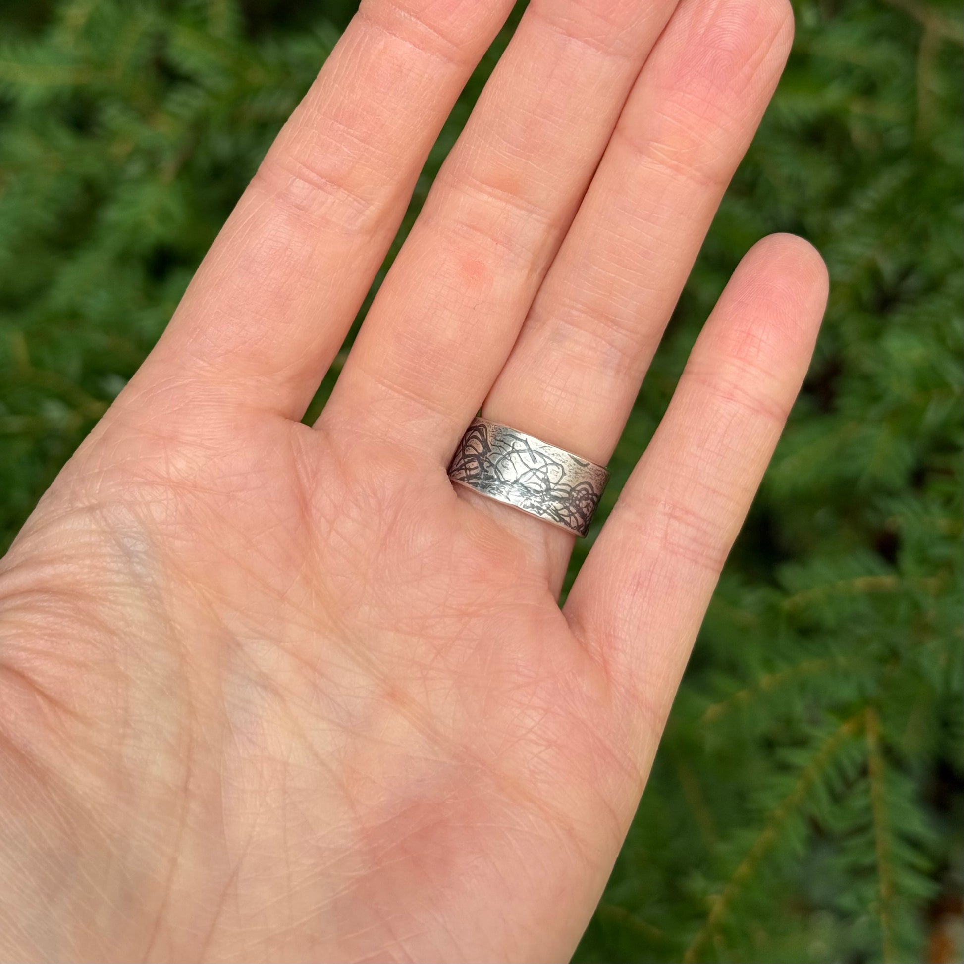 This ring carries the real texture of lichen I gathered on one of my forest walks, pressed gently into silver.