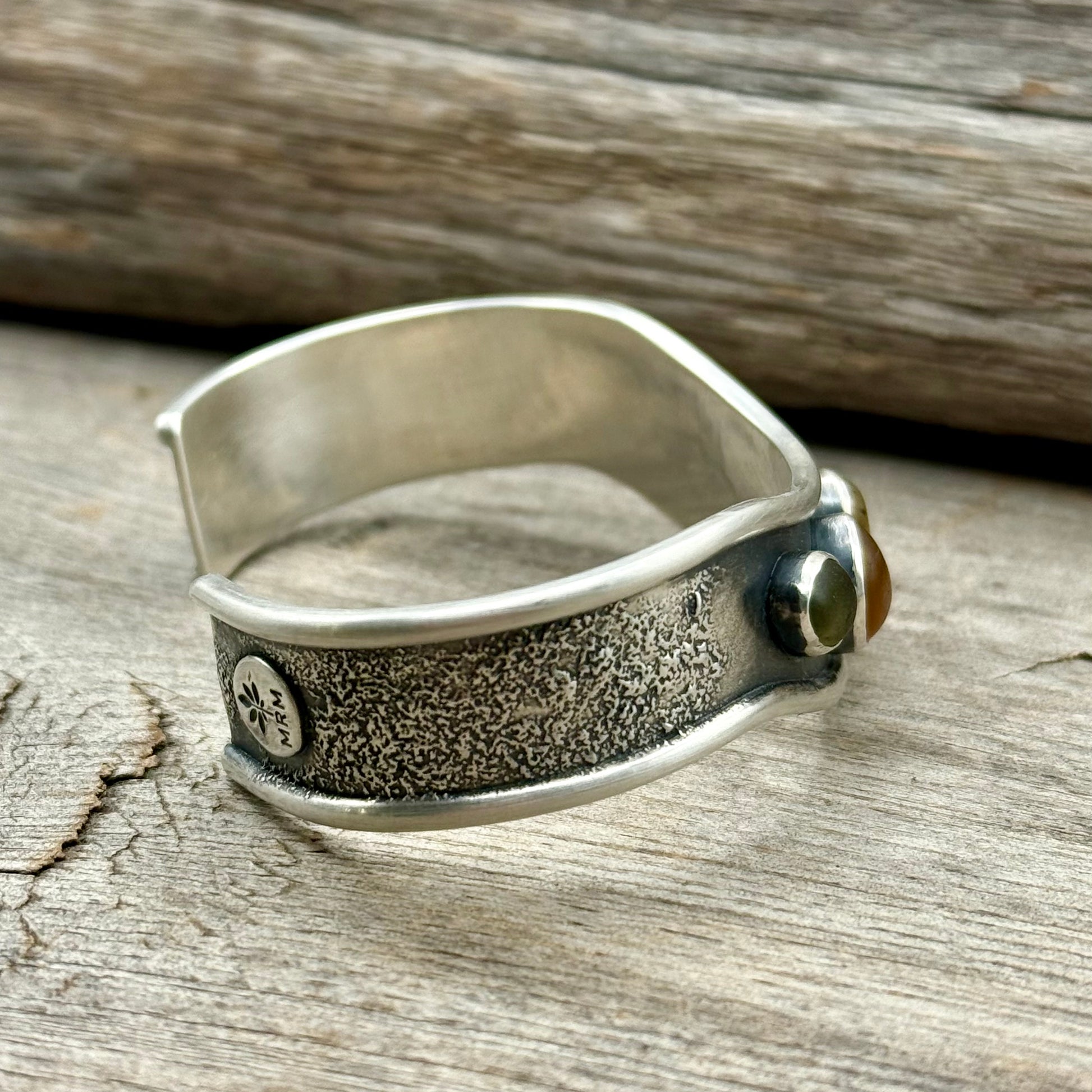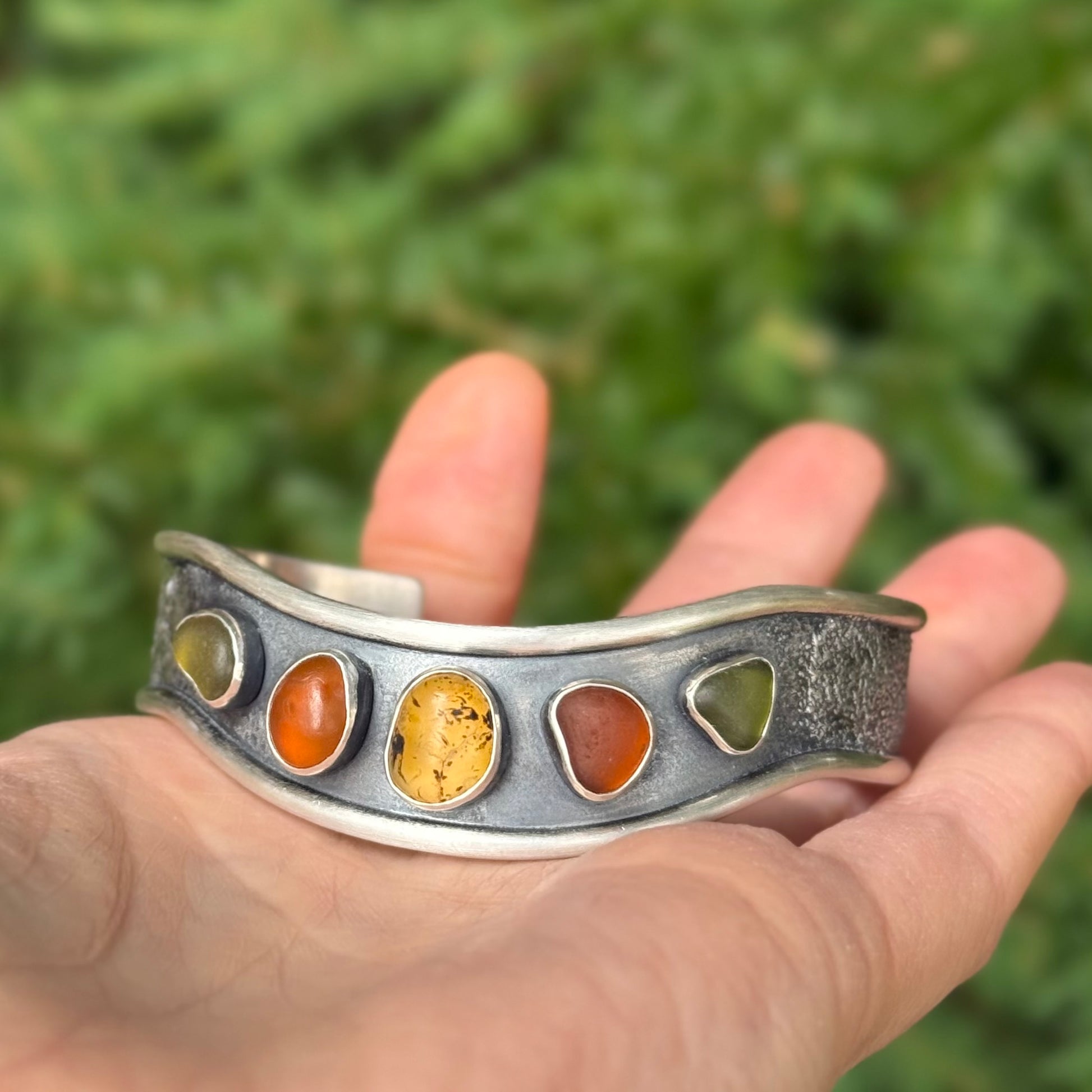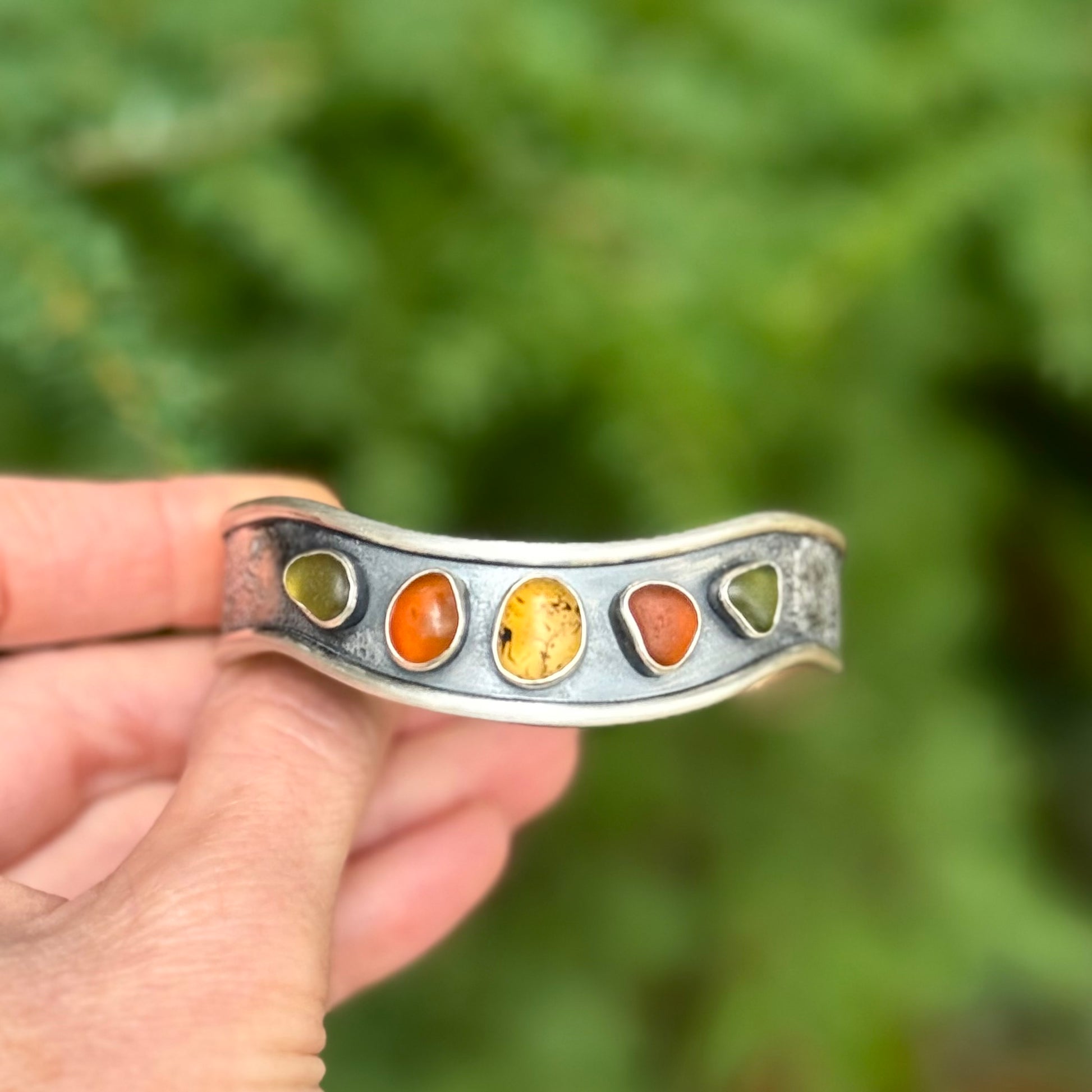 The amber tones of sea glass and ocean tumbled carnelian agate remind me of fall leaves scattered along the trail, while the rich greens mirror the mossy carpets that cover the forest floor.
