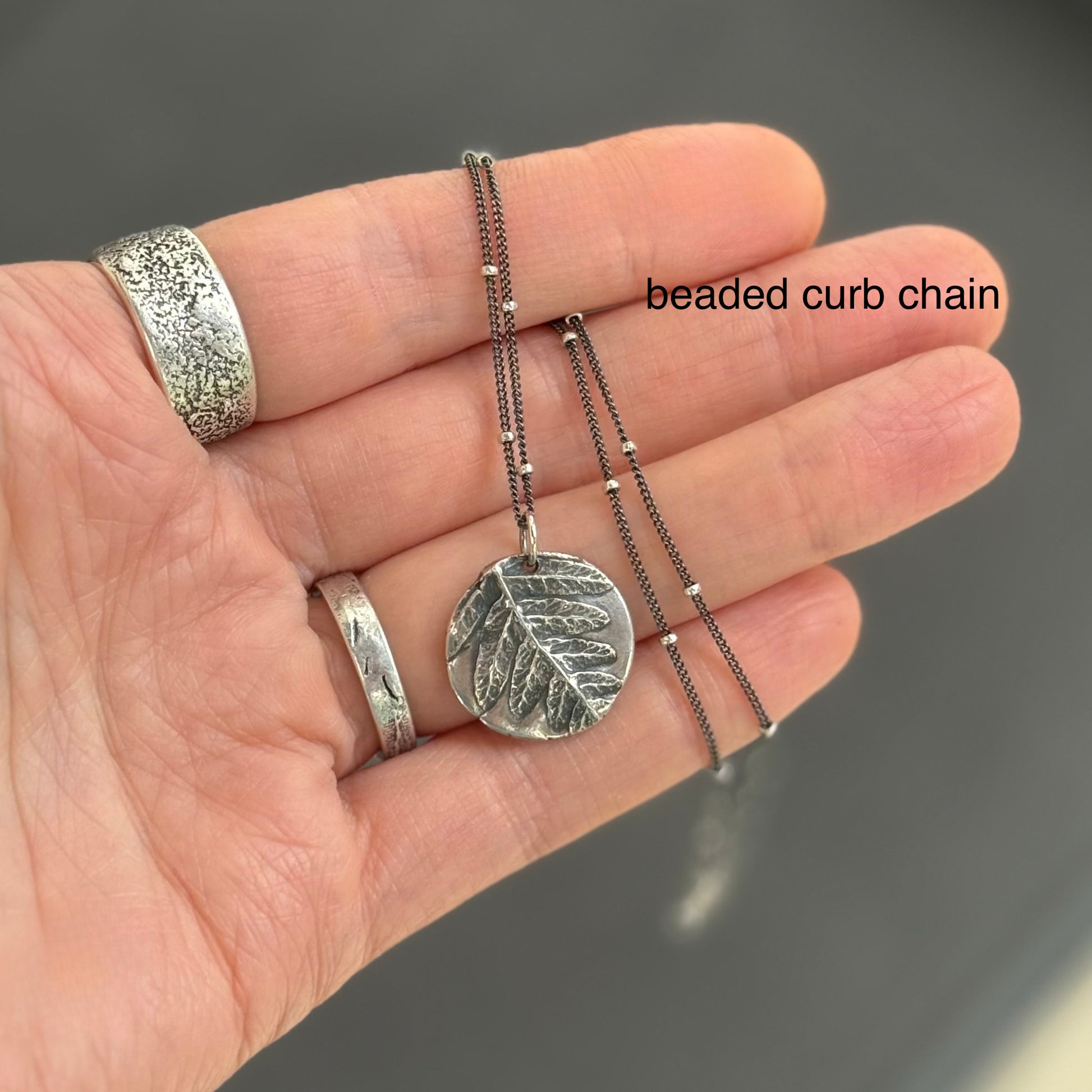 Comes suspended from an 18" oxidized beaded cable chain (OUT OF STOCK) see last photo for oxidized beaded curb chain option.