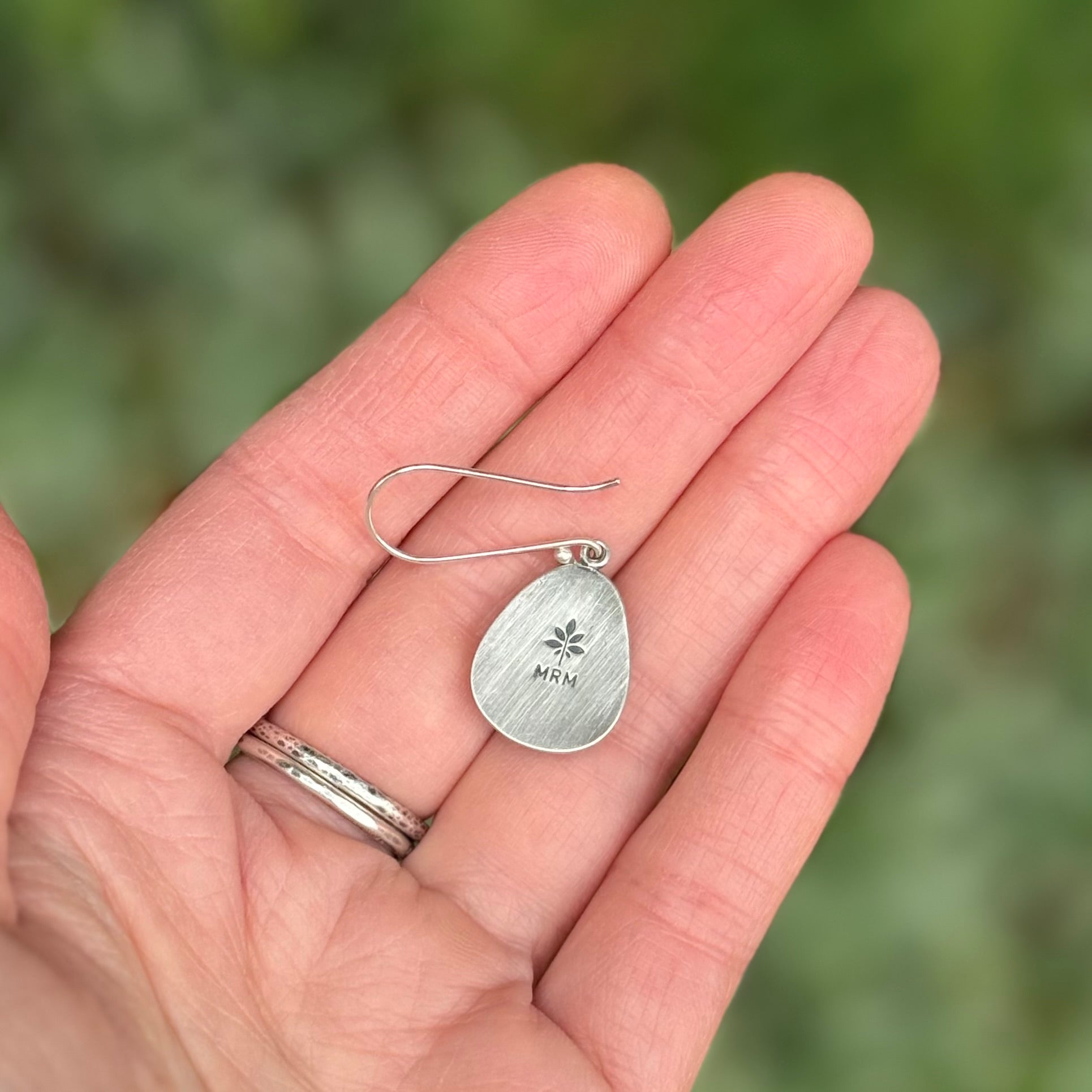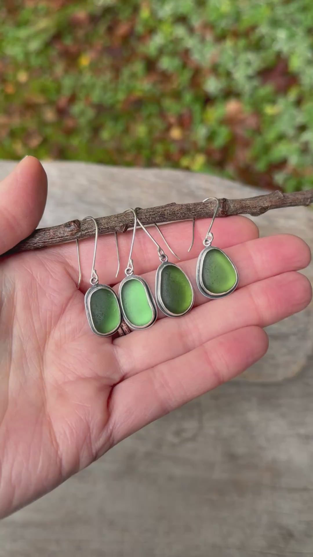 These sterling silver dangle drops feature English sea glass set in sterling and fine silver, finished with handmade sterling ear hooks.