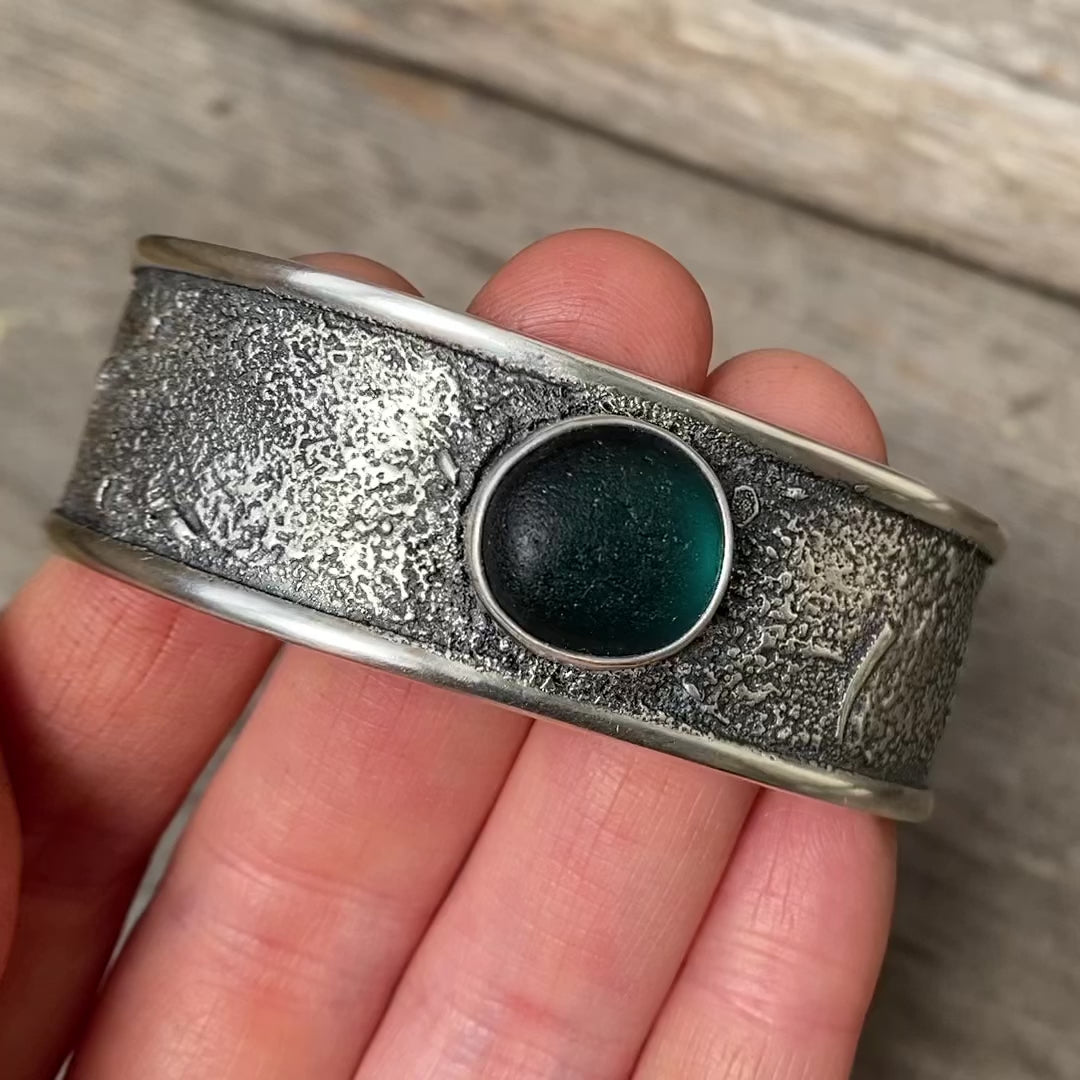Keep the ocean close with the Midnight Sea Cuff. Handcrafted with genuine midnight blue English sea glass,  it is completely handmade with sterling and fine silver and textured with fire and silver dust.
