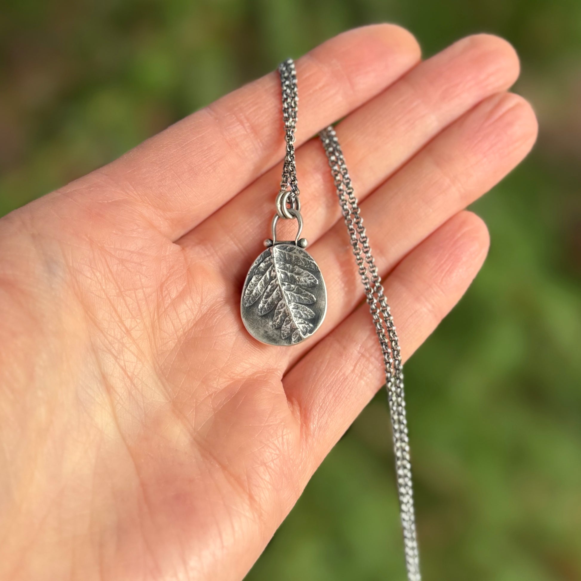 Completely handcrafted in fine and sterling silver, this pendant was created from an impression of a licorice fern that I collected on one of my many forest walks along the Oregon Coast.