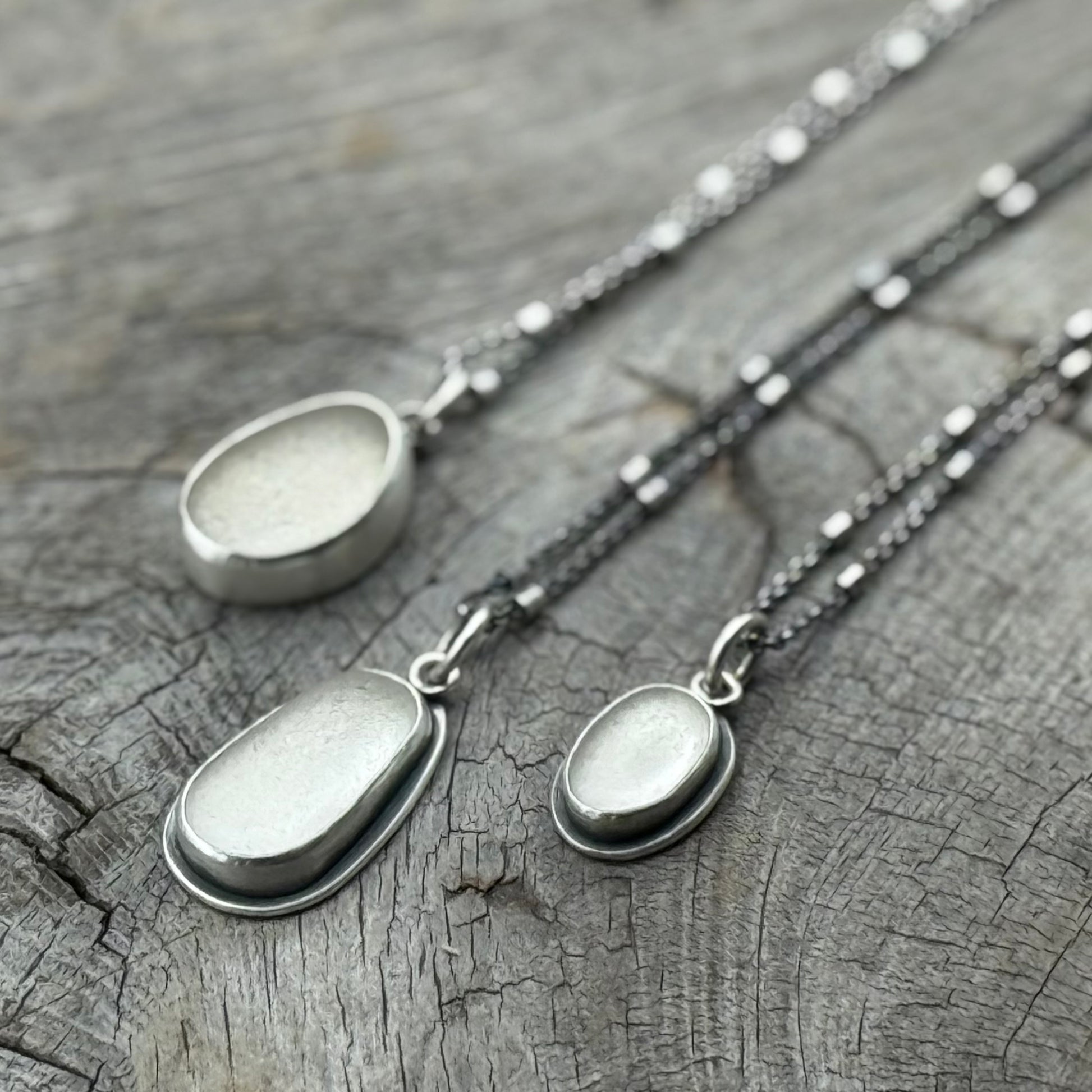 Encapsulated in a fine silver border, the sea glass rests on a sterling silver back plate that features my makers mark on the backside.